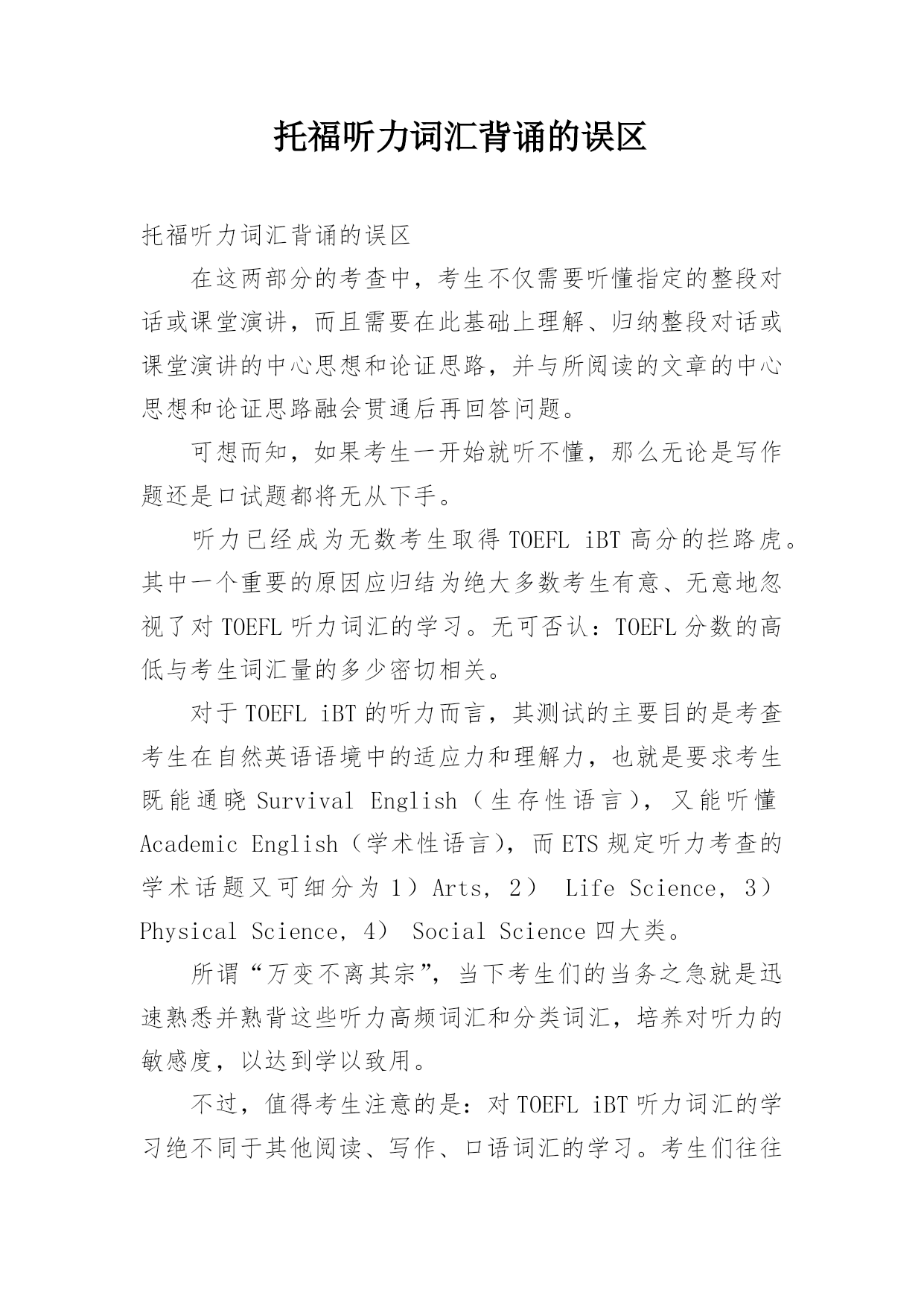 托福听力词汇背诵的误区托福听力词汇背诵的误区在这两部分的考查中,考生不仅需要听懂指定的整段对话或课堂演讲,而且需要在此基础上理解、归纳整段对话或课堂演讲的中心思想和论证思路,并与所阅读的文章的中心思想和论证思路融会贯通后再回答问题。可想而知,如果考生一开始就听不懂,那么无论是写作题还是口试题都将无从下手。听力已经成为无数考生取得TOEFLiBT高分的拦路虎。其中一个重要的原因应归结为绝大多数考生有意、无意地忽视了对TOEFL听力词汇的学习。无可否认:TOEFL分数的高低与考生词汇量的多少密切相关。对于TO