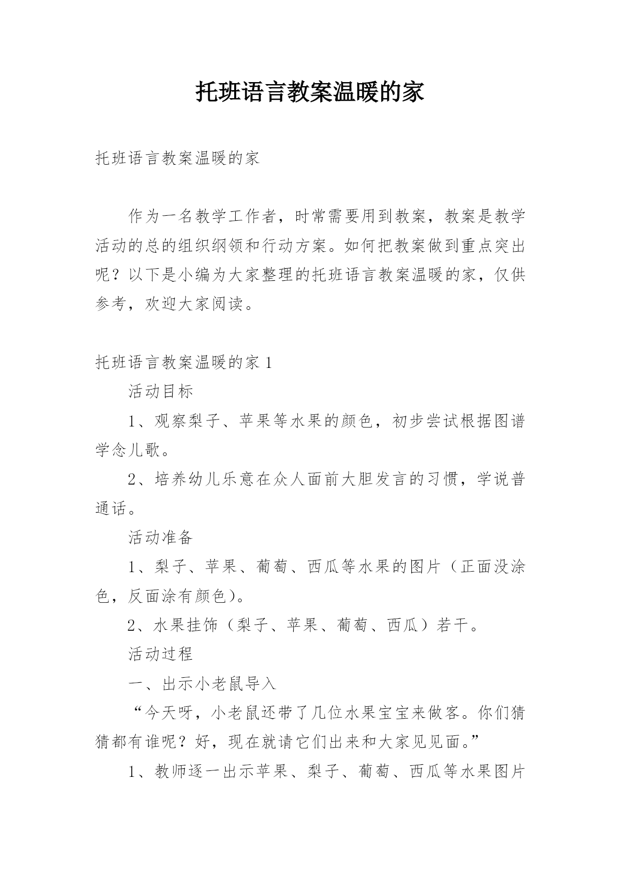 托班语言教案温暖的家托班语言教案温暖的家作为一名教学工作者,时常需要用到教案,教案是教学活动的总的组织纲领和行动方案。如何把教案做到重点突出呢?以下是小编为大家整理的托班语言教案温暖的家,仅供参考,欢迎大家阅读。托班语言教案温暖的家1活动目标1、观察梨子、苹果等水果的颜色,初步尝试根据图谱学念儿歌。2、培养幼儿乐意在众人面前大胆发言的习惯,学说普通话。活动准备1、梨子、苹果、葡萄、西瓜等水果的图片(正面没涂色,反面涂有颜色)。2、水果挂饰(梨子、苹果、葡萄、西瓜)若干。活动过程一、出示小老鼠导入“今天呀,