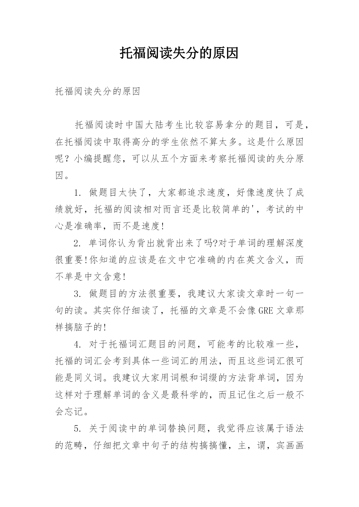 托福阅读失分的原因托福阅读失分的原因托福阅读时中国大陆考生比较容易拿分的题目,可是,在托福阅读中取得高分的学生依然不算太多。这是什么原因呢?小编提醒您,可以从五个方面来考察托福阅读的失分原因。1.做题目太快了,大家都追求速度,好像速度快了成绩就好,托福的阅读相对而言还是比较简单的',考试的中心是准确率,而不是速度!2.单词你认为背出就背出来了吗?对于单词的理解深度很重要!你知道的应该是在文中它准确的内在英文含义,而不单是中文含意!3.做题目的方法很重要,我建议大家读文章时一句一句的读。其实你仔细读了,托福