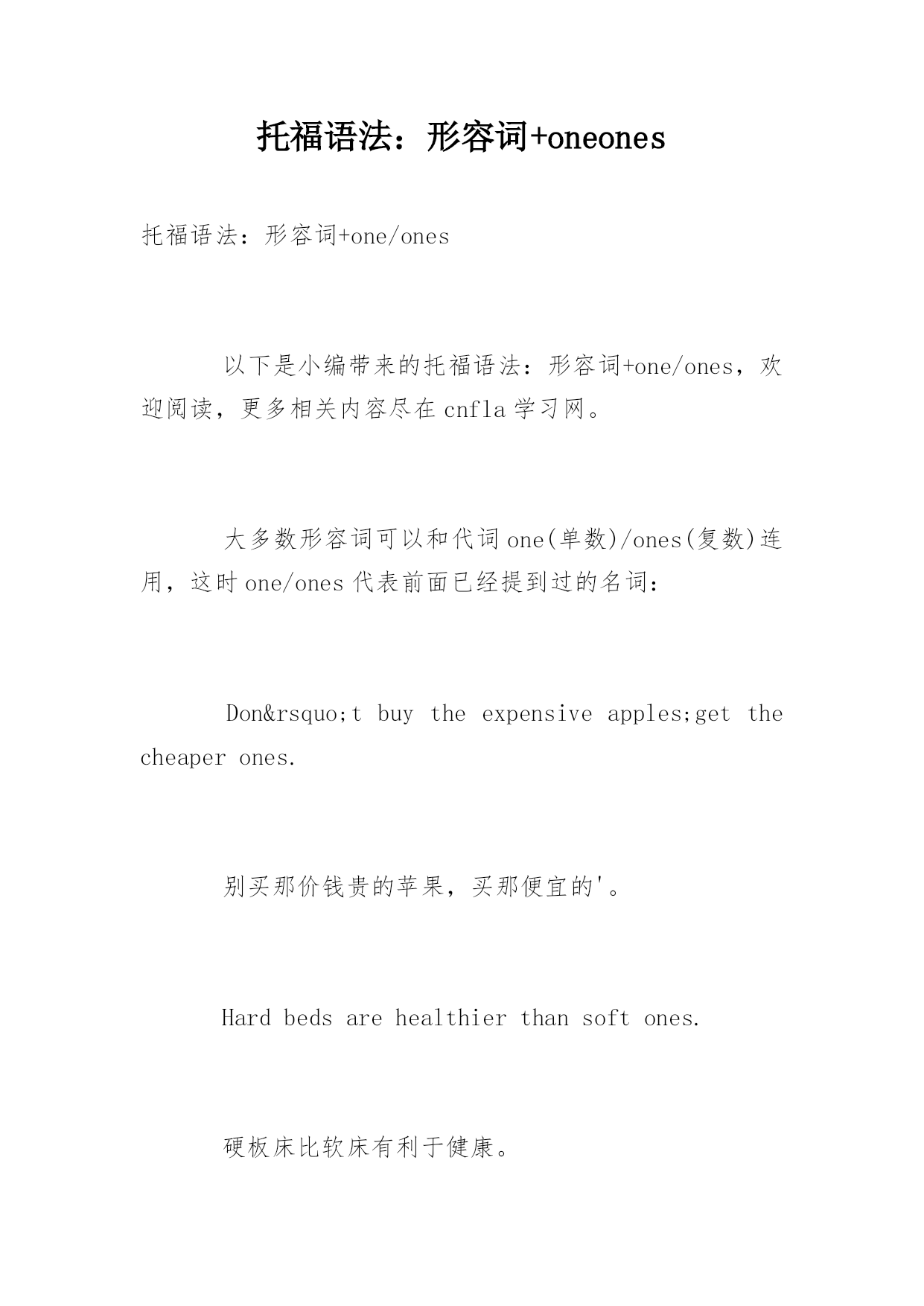 托福语法:形容词+oneones托福语法:形容词+one/ones以下是小编带来的托福语法:形容词+one/ones,欢迎阅读,更多相关内容尽在cnfla学习网。大多数形容词可以和代词one(单数)/ones(复数)连用,这时one/ones代表前面已经提到过的名词:Don’tbuytheexpensiveapples;getthecheaperones.别买那价钱贵的苹果,买那便宜的'。Hardbedsarehealthierthansoftones.硬板床比软床有利于健康。Ilostmyo