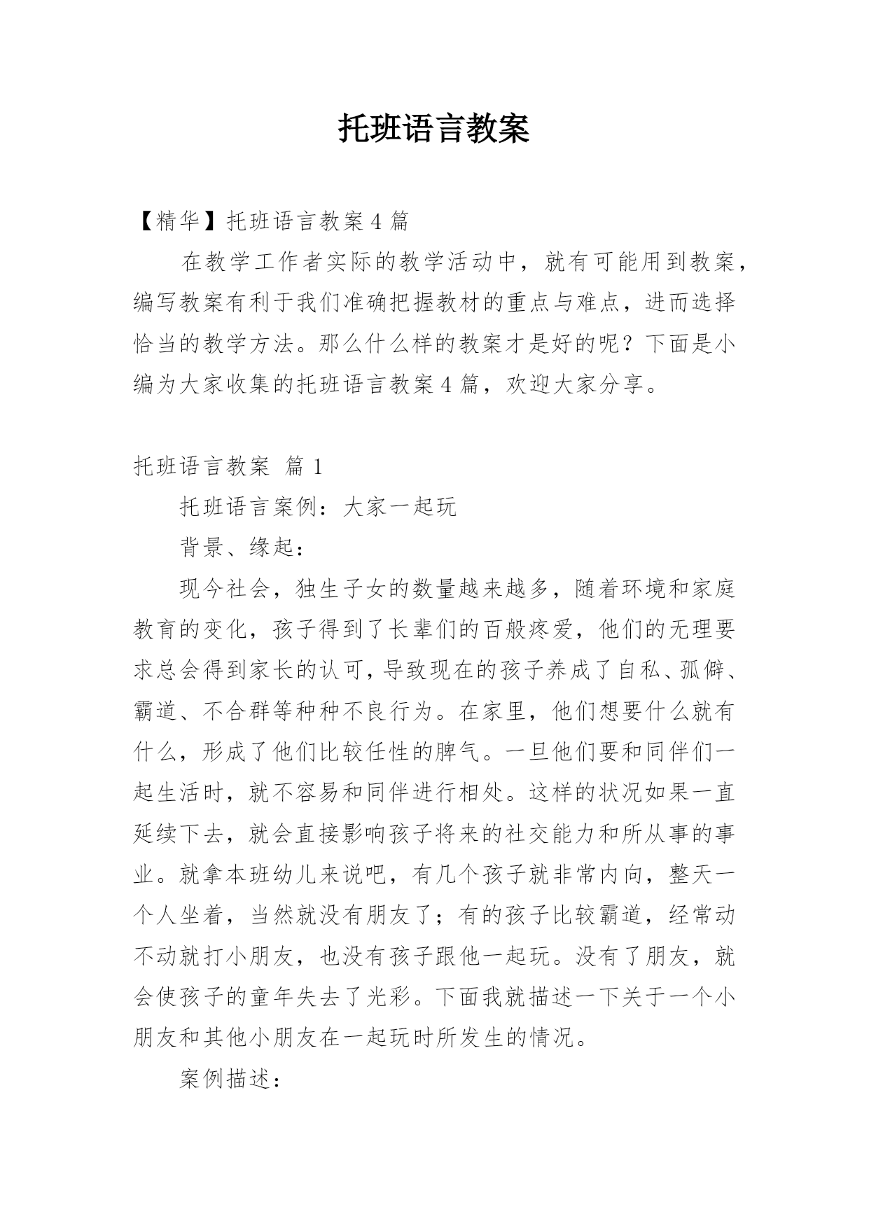 托班语言教案【精华】托班语言教案4篇在教学工作者实际的教学活动中,就有可能用到教案,编写教案有利于我们准确把握教材的重点与难点,进而选择恰当的教学方法。那么什么样的教案才是好的呢?下面是小编为大家收集的托班语言教案4篇,欢迎大家分享。托班语言教案篇1托班语言案例:大家一起玩背景、缘起:现今社会,独生子女的数量越来越多,随着环境和家庭教育的变化,孩子得到了长辈们的百般疼爱,他们的无理要求总会得到家长的认可,导致现在的孩子养成了自私、孤僻、霸道、不合群等种种不良行为。在家里,他们想要什么就有什么,形成了他们比