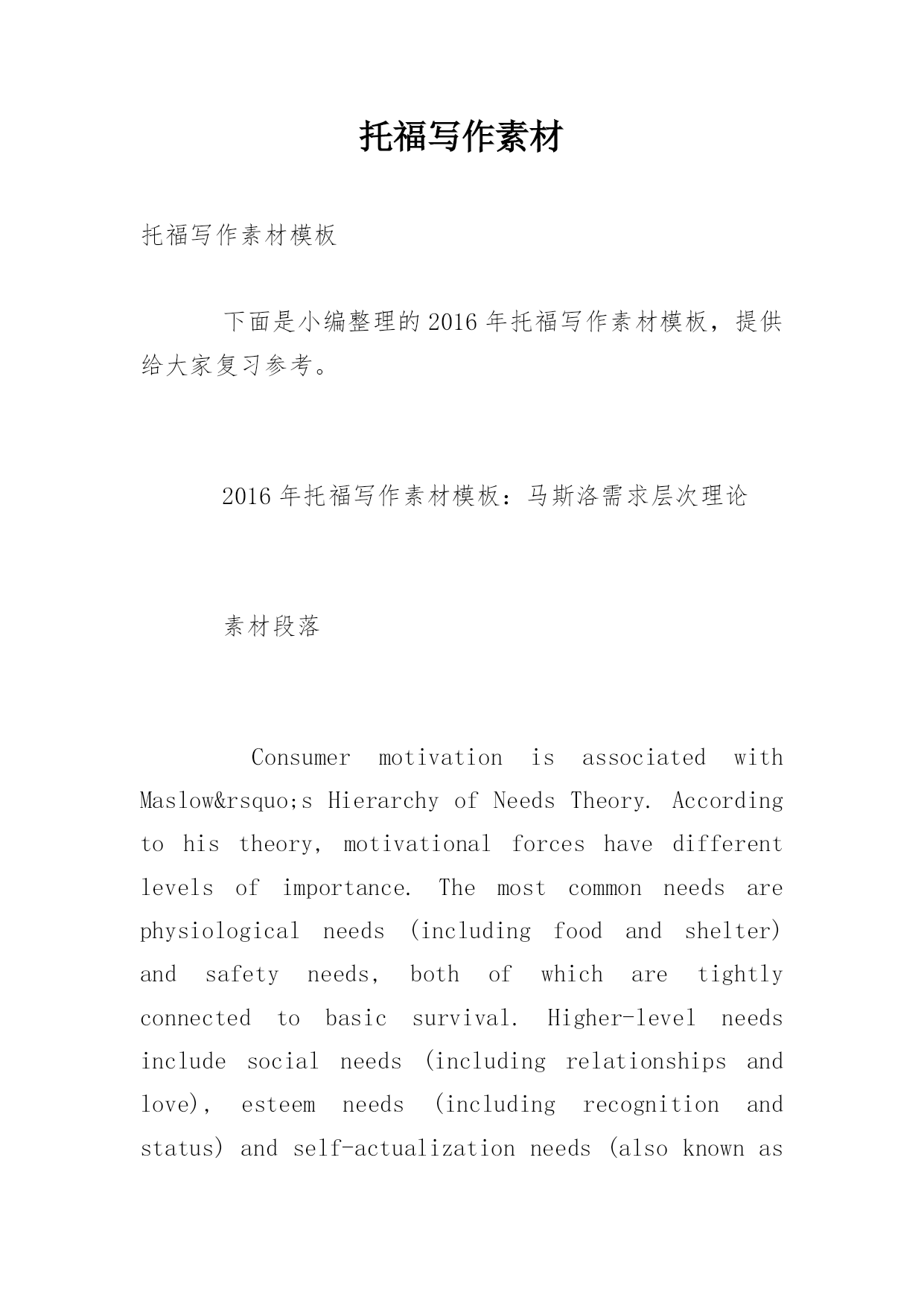 托福写作素材托福写作素材模板下面是小编整理的2016年托福写作素材模板,提供给大家复习参考。2016年托福写作素材模板:马斯洛需求层次理论素材段落ConsumermotivationisassociatedwithMaslow’sHierarchyofNeedsTheory.Accordingtohistheory,motivationalforceshavedifferentlevelsofimportance.Themostcommonneedsarephysiologicalneeds(