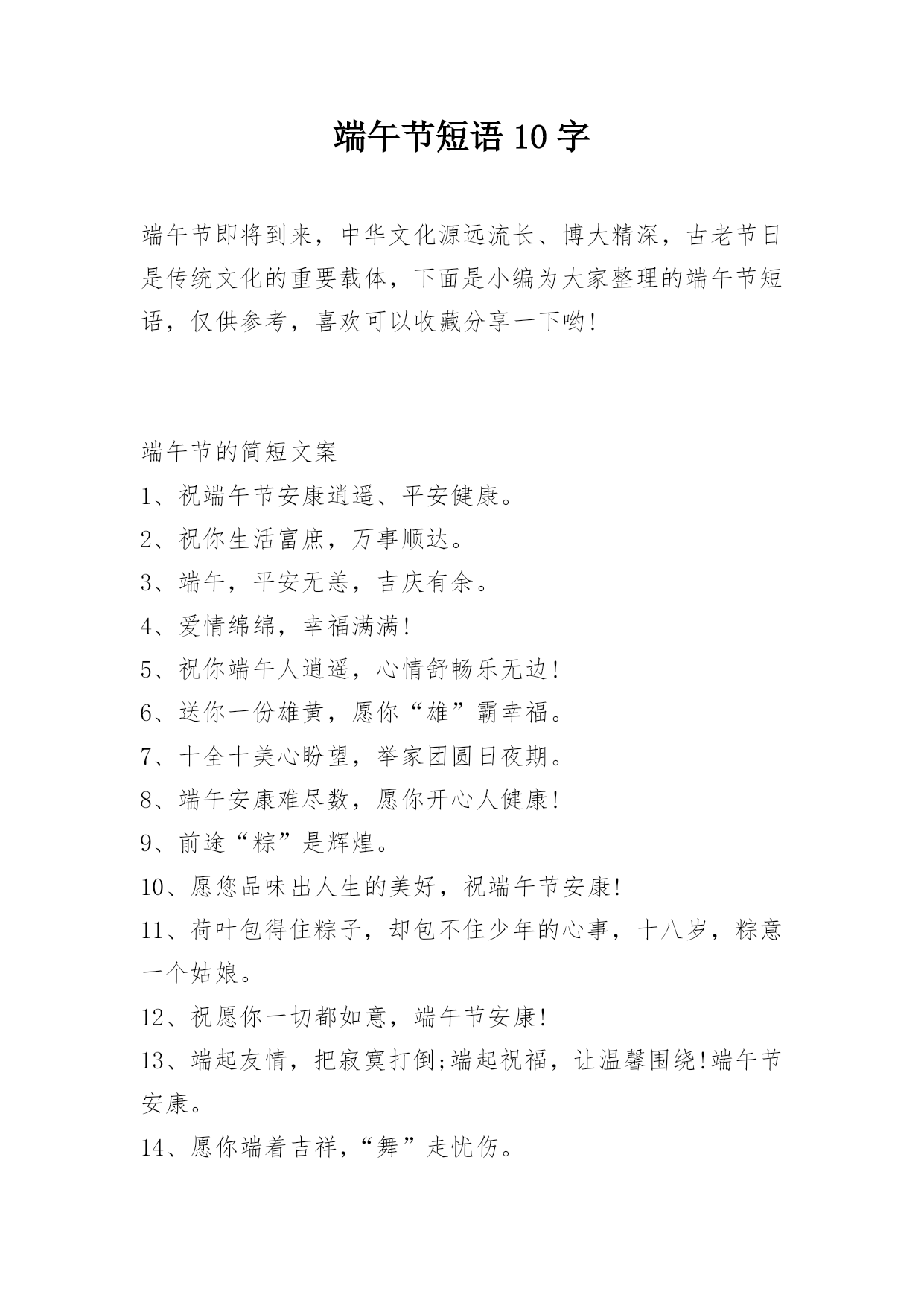 端午节短语10字端午节即将到来,中华文化源远流长、博大精深,古老节日是传统文化的重要载体,下面是小编为大家整理的端午节短语,仅供参考,喜欢可以收藏分享一下哟!端午节的简短文案1、祝端午节安康逍遥、平安健康。2、祝你生活富庶,万事顺达。3、端午,平安无恙,吉庆有余。4、爱情绵绵,幸福满满!5、祝你端午人逍遥,心情舒畅乐无边!6、送你一份雄黄,愿你“雄”霸幸福。7、十全十美心盼望,举家团圆日夜期。8、端午安康难尽数,愿你开心人健康!9、前途“粽”是辉煌。10、愿您品味出人生的美好,祝端午节安康!11、荷叶包得