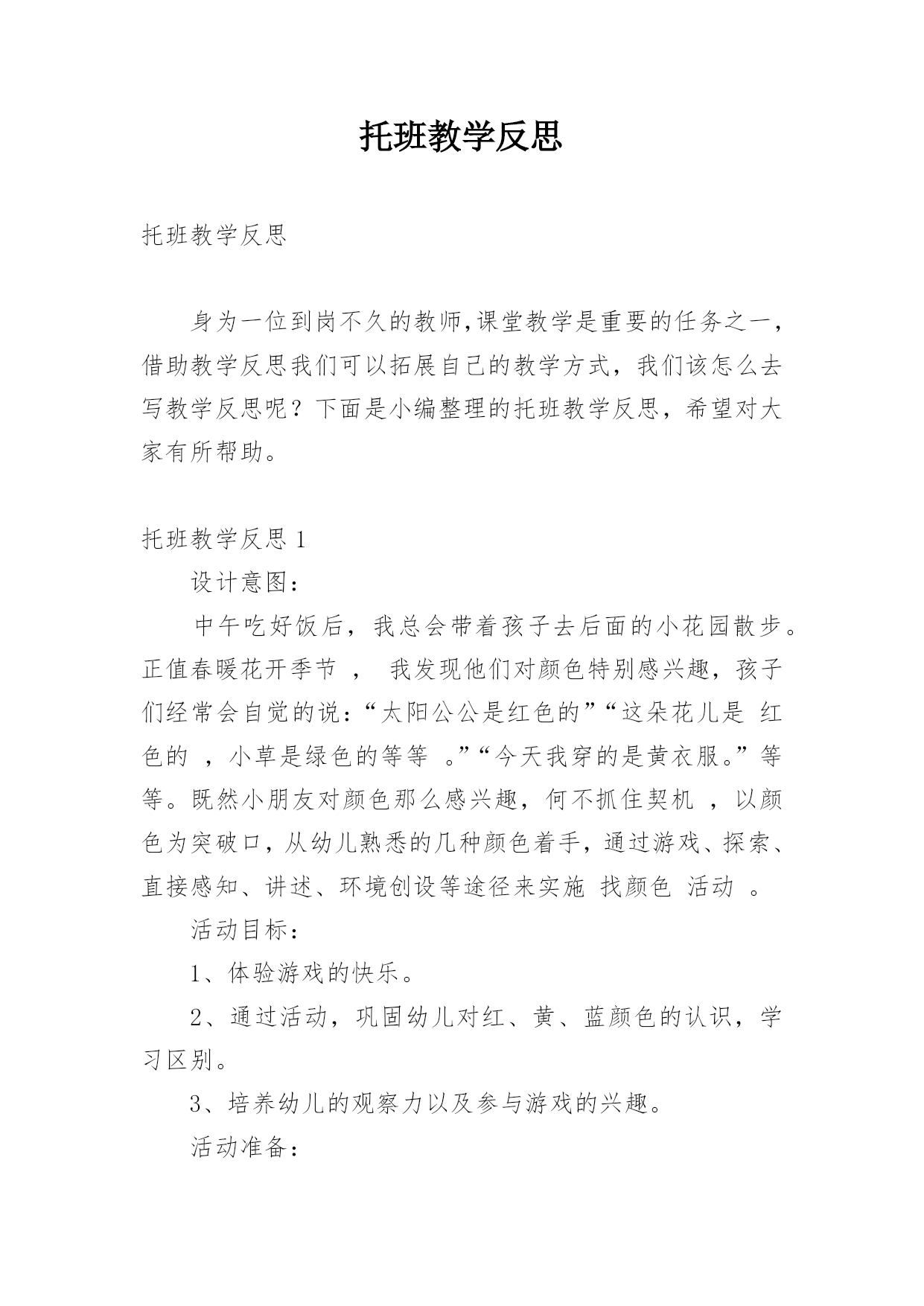 托班教学反思托班教学反思身为一位到岗不久的教师,课堂教学是重要的任务之一,借助教学反思我们可以拓展自己的教学方式,我们该怎么去写教学反思呢?下面是小编整理的托班教学反思,希望对大家有所帮助。托班教学反思1设计意图:中午吃好饭后,我总会带着孩子去后面的小花园散步。正值春暖花开季节,我发现他们对颜色特别感兴趣,孩子们经常会自觉的说:“太阳公公是红色的”“这朵花儿是红色的,小草是绿色的等等。”“今天我穿的是黄衣服。”等等。既然小朋友对颜色那么感兴趣,何不抓住契机,以颜色为突破口,从幼儿熟悉的几种颜色着手,通过游