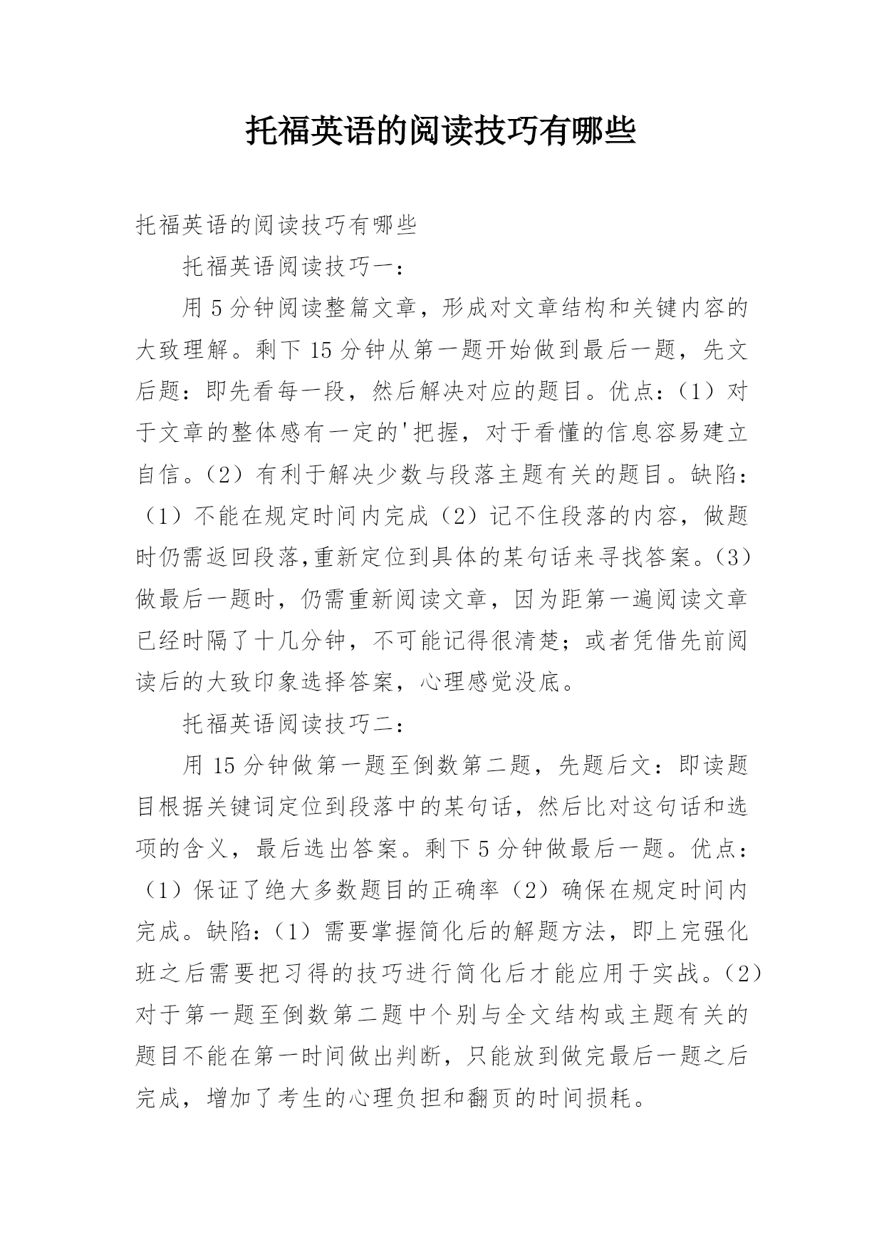 托福英语的阅读技巧有哪些托福英语的阅读技巧有哪些托福英语阅读技巧一:用5分钟阅读整篇文章,形成对文章结构和关键内容的大致理解。剩下15分钟从第一题开始做到最后一题,先文后题:即先看每一段,然后解决对应的题目。优点:(1)对于文章的整体感有一定的'把握,对于看懂的信息容易建立自信。(2)有利于解决少数与段落主题有关的题目。缺陷:(1)不能在规定时间内完成(2)记不住段落的内容,做题时仍需返回段落,重新定位到具体的某句话来寻找答案。(3)做最后一题时,仍需重新阅读文章,因为距第一遍阅读文章已经时隔了十几分钟,