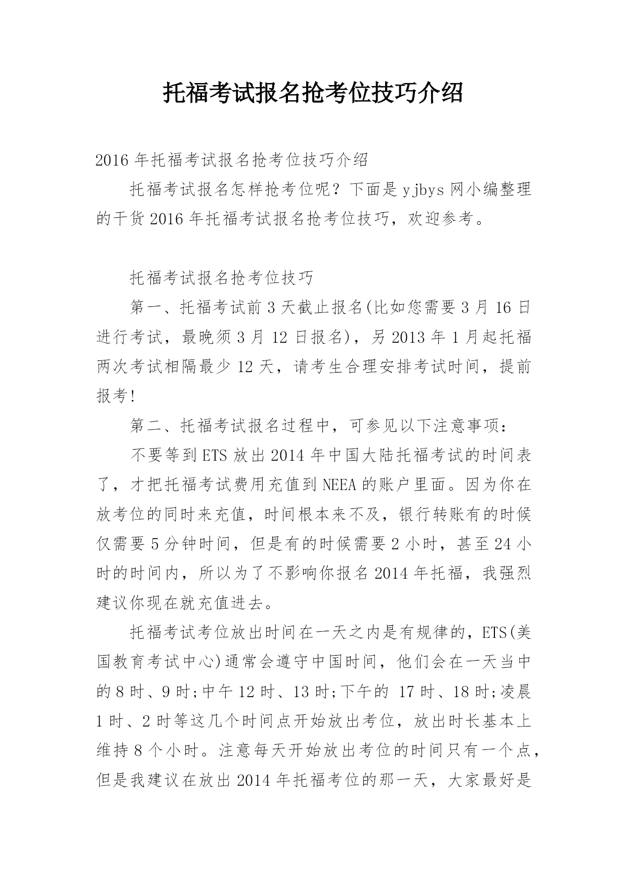 托福考试报名抢考位技巧介绍2016年托福考试报名抢考位技巧介绍托福考试报名怎样抢考位呢?下面是yjbys网小编整理的干货2016年托福考试报名抢考位技巧,欢迎参考。托福考试报名抢考位技巧第一、托福考试前3天截止报名(比如您需要3月16日进行考试,最晚须3月12日报名),另2013年1月起托福两次考试相隔最少12天,请考生合理安排考试时间,提前报考!第二、托福考试报名过程中,可参见以下注意事项:不要等到ETS放出2014年中国大陆托福考试的时间表了,才把托福考试费用充值到NEEA的账户里面。因为你在放考位的