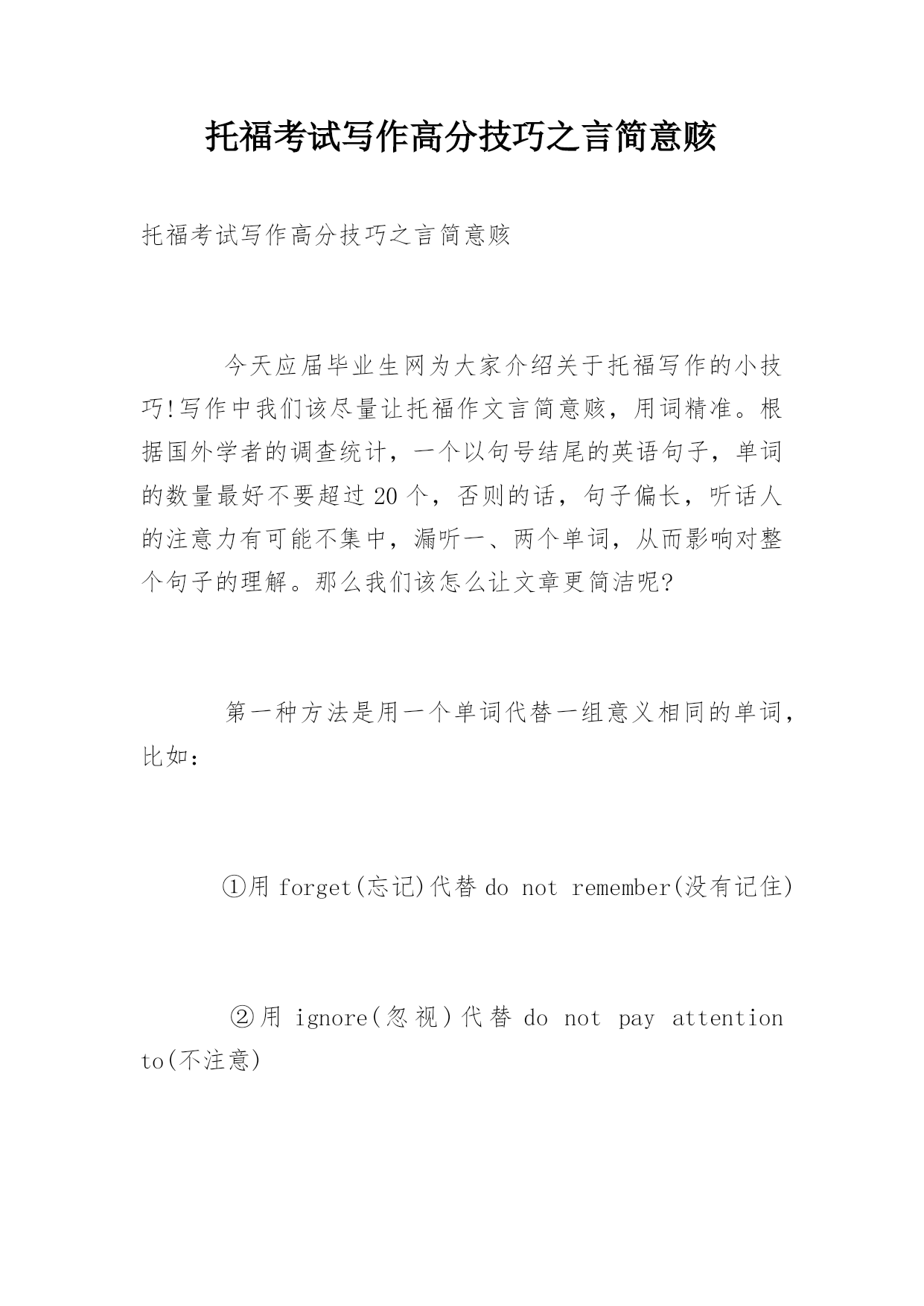 托福考试写作高分技巧之言简意赅托福考试写作高分技巧之言简意赅今天应届毕业生网为大家介绍关于托福写作的小技巧!写作中我们该尽量让托福作文言简意赅,用词精准。根据国外学者的调查统计,一个以句号结尾的英语句子,单词的数量最好不要超过20个,否则的话,句子偏长,听话人的注意力有可能不集中,漏听一、两个单词,从而影响对整个句子的理解。那么我们该怎么让文章更简洁呢?第一种方法是用一个单词代替一组意义相同的单词,比如:①用forget(忘记)代替donotremember(没有记住)②用ignore(忽视)代替dono
