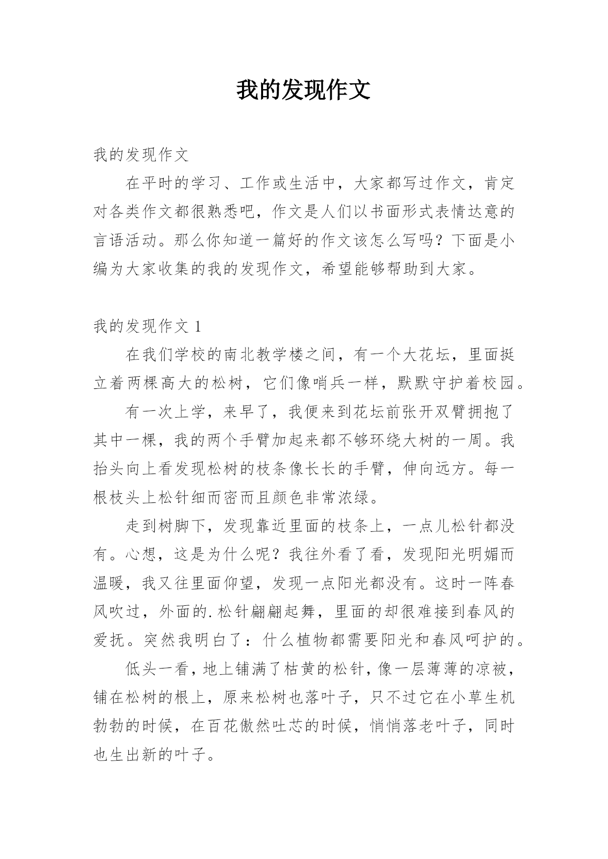 我的发现作文我的发现作文在平时的学习、工作或生活中,大家都写过作文,肯定对各类作文都很熟悉吧,作文是人们以书面形式表情达意的言语活动。那么你知道一篇好的作文该怎么写吗?下面是小编为大家收集的我的发现作文,希望能够帮助到大家。我的发现作文1在我们学校的南北教学楼之间,有一个大花坛,里面挺立着两棵高大的松树,它们像哨兵一样,默默守护着校园。有一次上学,来早了,我便来到花坛前张开双臂拥抱了其中一棵,我的两个手臂加起来都不够环绕大树的一周。我抬头向上看发现松树的枝条像长长的手臂,伸向远方。每一根枝头上松针细而密而