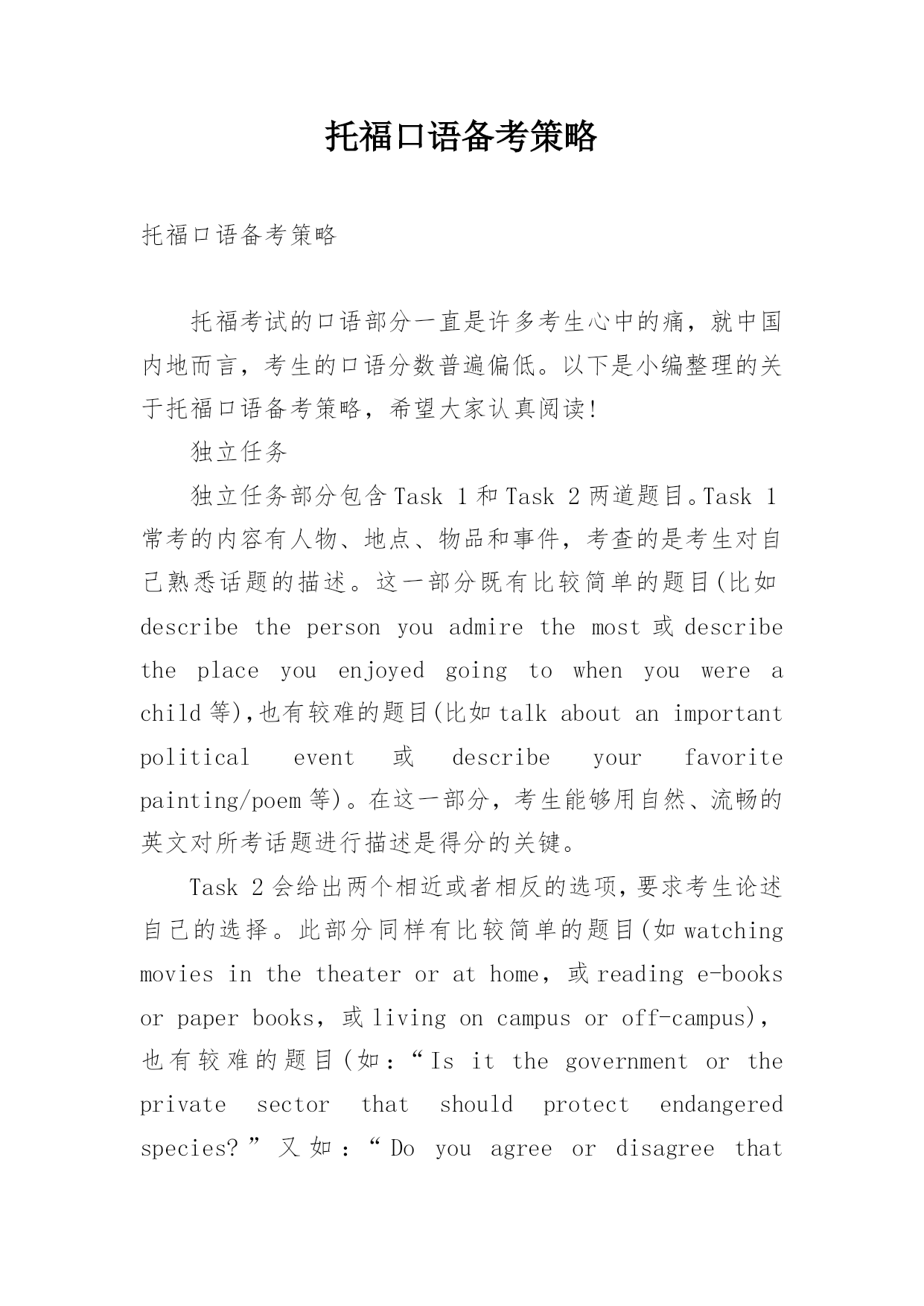 托福口语备考策略托福口语备考策略托福考试的口语部分一直是许多考生心中的痛,就中国内地而言,考生的口语分数普遍偏低。以下是小编整理的关于托福口语备考策略,希望大家认真阅读!独立任务独立任务部分包含Task1和Task2两道题目。Task1常考的内容有人物、地点、物品和事件,考查的是考生对自己熟悉话题的描述。这一部分既有比较简单的题目(比如describethepersonyouadmirethemost或describetheplaceyouenjoyedgoingtowhenyouwereachild等)