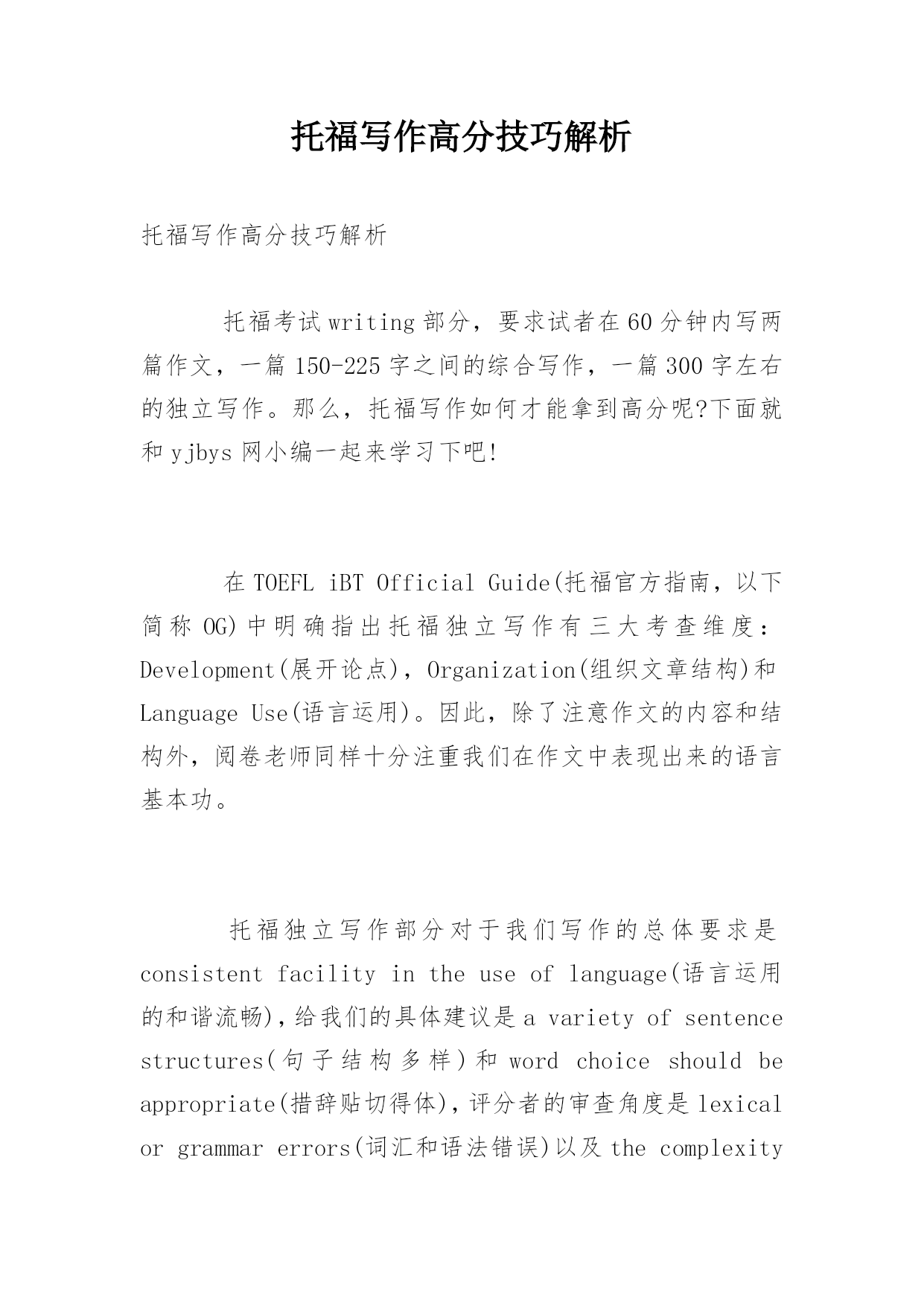 托福写作高分技巧解析托福写作高分技巧解析托福考试writing部分,要求试者在60分钟内写两篇作文,一篇150-225字之间的综合写作,一篇300字左右的独立写作。那么,托福写作如何才能拿到高分呢?下面就和yjbys网小编一起来学习下吧!在TOEFLiBTOfficialGuide(托福官方指南,以下简称OG)中明确指出托福独立写作有三大考查维度:Development(展开论点),Organization(组织文章结构)和LanguageUse(语言运用)。因此,除了注意作文的内容和结构外,阅卷老师同样