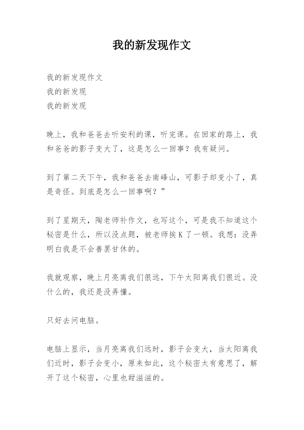 我的新发现作文我的新发现作文我的新发现我的新发现晚上,我和爸爸去听安利的课,听完课。在回家的路上,我和爸爸的影子变大了,这是怎么一回事?我有疑问。到了第二天下午,我和爸爸去南峰山,可影子却变小了,真是奇怪。到底是怎么一回事啊?”到了星期天,陶老师补作文,也写这个,可是我不知道这个秘密是什么,所以没点题,被老师挨K了一顿。我想:没弄明白我是不会善罢甘休的。我就观察,晚上月亮离我们很远,下午太阳离我们很近。没什么的,我还是没弄懂。只好去问电脑。电脑上显示,当月亮离我们远时,影子会变大,当太阳离我们近时,影子会