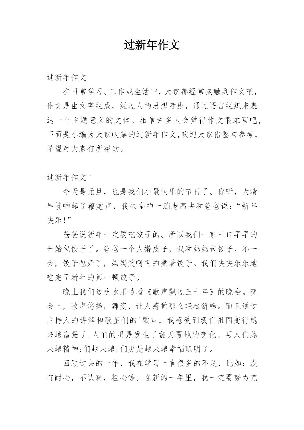 过新年作文过新年作文在日常学习、工作或生活中,大家都经常接触到作文吧,作文是由文字组成,经过人的思想考虑,通过语言组织来表达一个主题意义的文体。相信许多人会觉得作文很难写吧,下面是小编为大家收集的过新年作文,欢迎大家借鉴与参考,希望对大家有所帮助。过新年作文1今天是元旦,也是我们小最快乐的节日了。你听,大清早就响起了鞭炮声,我兴奋的一蹦老高去和爸爸说:“新年快乐!”爸爸说新年一定要吃饺子的。所以我们一家三口早早的开始包饺子了。爸爸一个人擀皮子,我和妈妈包饺子。不一会,饺子包好了,妈妈笑呵呵的煮着饺子。我们