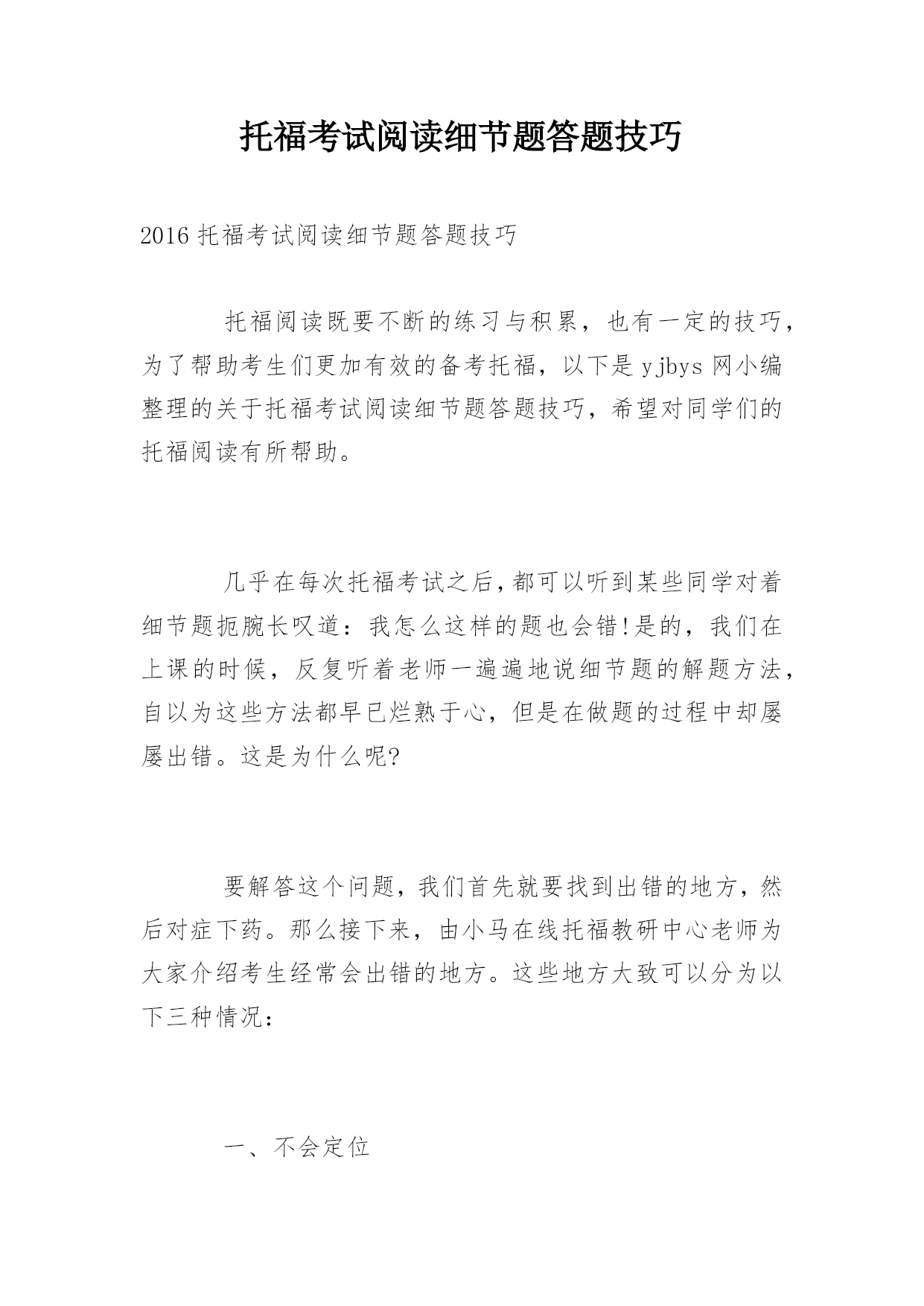 托福考试阅读细节题答题技巧2016托福考试阅读细节题答题技巧托福阅读既要不断的练习与积累,也有一定的技巧,为了帮助考生们更加有效的备考托福,以下是yjbys网小编整理的关于托福考试阅读细节题答题技巧,希望对同学们的托福阅读有所帮助。几乎在每次托福考试之后,都可以听到某些同学对着细节题扼腕长叹道:我怎么这样的题也会错!是的,我们在上课的时候,反复听着老师一遍遍地说细节题的解题方法,自以为这些方法都早已烂熟于心,但是在做题的过程中却屡屡出错。这是为什么呢?要解答这个问题,我们首先就要找到出错的地方,然后对症下