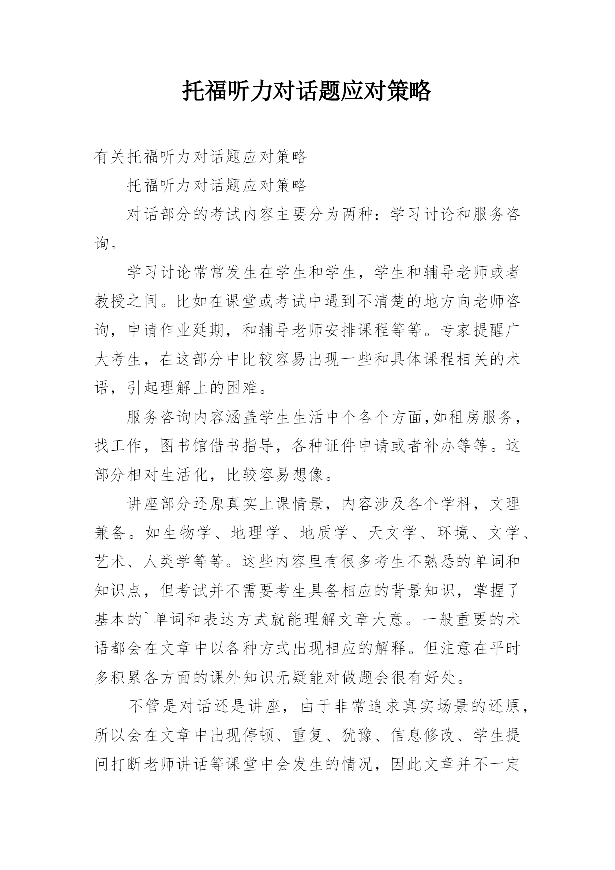 托福听力对话题应对策略有关托福听力对话题应对策略托福听力对话题应对策略对话部分的考试内容主要分为两种:学习讨论和服务咨询。学习讨论常常发生在学生和学生,学生和辅导老师或者教授之间。比如在课堂或考试中遇到不清楚的地方向老师咨询,申请作业延期,和辅导老师安排课程等等。专家提醒广大考生,在这部分中比较容易出现一些和具体课程相关的术语,引起理解上的困难。服务咨询内容涵盖学生生活中个各个方面,如租房服务,找工作,图书馆借书指导,各种证件申请或者补办等等。这部分相对生活化,比较容易想像。讲座部分还原真实上课情景,内容