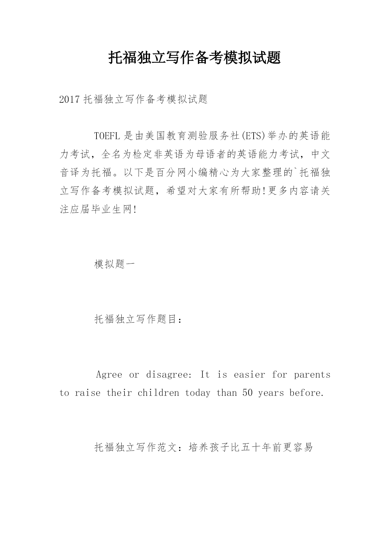 托福独立写作备考模拟试题2017托福独立写作备考模拟试题TOEFL是由美国教育测验服务社(ETS)举办的英语能力考试,全名为检定非英语为母语者的英语能力考试,中文音译为托福。以下是百分网小编精心为大家整理的`托福独立写作备考模拟试题,希望对大家有所帮助!更多内容请关注应届毕业生网!模拟题一托福独立写作题目:Agreeordisagree:Itiseasierforparentstoraisetheirchildrentodaythan50yearsbefore.托福独立写作范文:培养孩子比五十年前更容易S