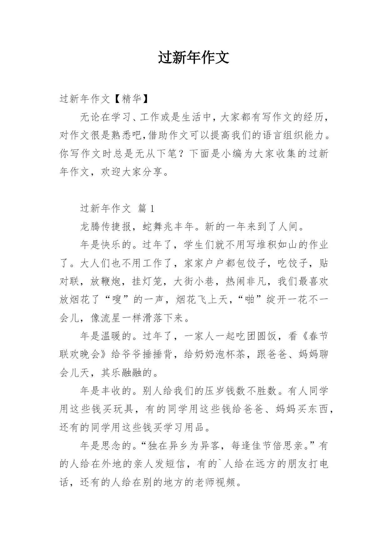 过新年作文过新年作文【精华】无论在学习、工作或是生活中,大家都有写作文的经历,对作文很是熟悉吧,借助作文可以提高我们的语言组织能力。你写作文时总是无从下笔?下面是小编为大家收集的过新年作文,欢迎大家分享。过新年作文篇1龙腾传捷报,蛇舞兆丰年。新的一年来到了人间。年是快乐的。过年了,学生们就不用写堆积如山的作业了。大人们也不用工作了,家家户户都包饺子,吃饺子,贴对联,放鞭炮,挂灯笼,大街小巷,热闹非凡,我们最喜欢放烟花了“嗖”的一声,烟花飞上天,“啪”绽开一花不一会儿,像流星一样滑落下来。年是温暖的。过年了