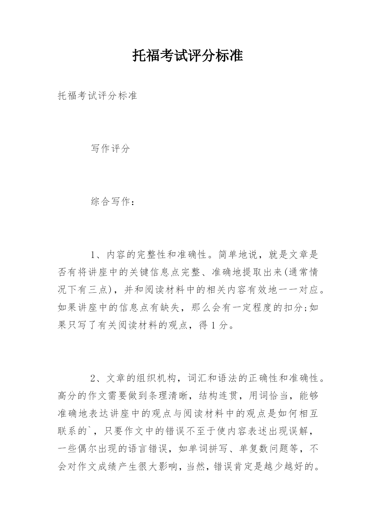 托福考试评分标准托福考试评分标准写作评分综合写作:1、内容的完整性和准确性。简单地说,就是文章是否有将讲座中的关键信息点完整、准确地提取出来(通常情况下有三点),并和阅读材料中的相关内容有效地一一对应。如果讲座中的信息点有缺失,那么会有一定程度的扣分;如果只写了有关阅读材料的观点,得1分。2、文章的组织机构,词汇和语法的正确性和准确性。高分的作文需要做到条理清晰,结构连贯,用词恰当,能够准确地表达讲座中的观点与阅读材料中的观点是如何相互联系的`,只要作文中的错误不至于使内容表述出现误解,一些偶尔出现的语言