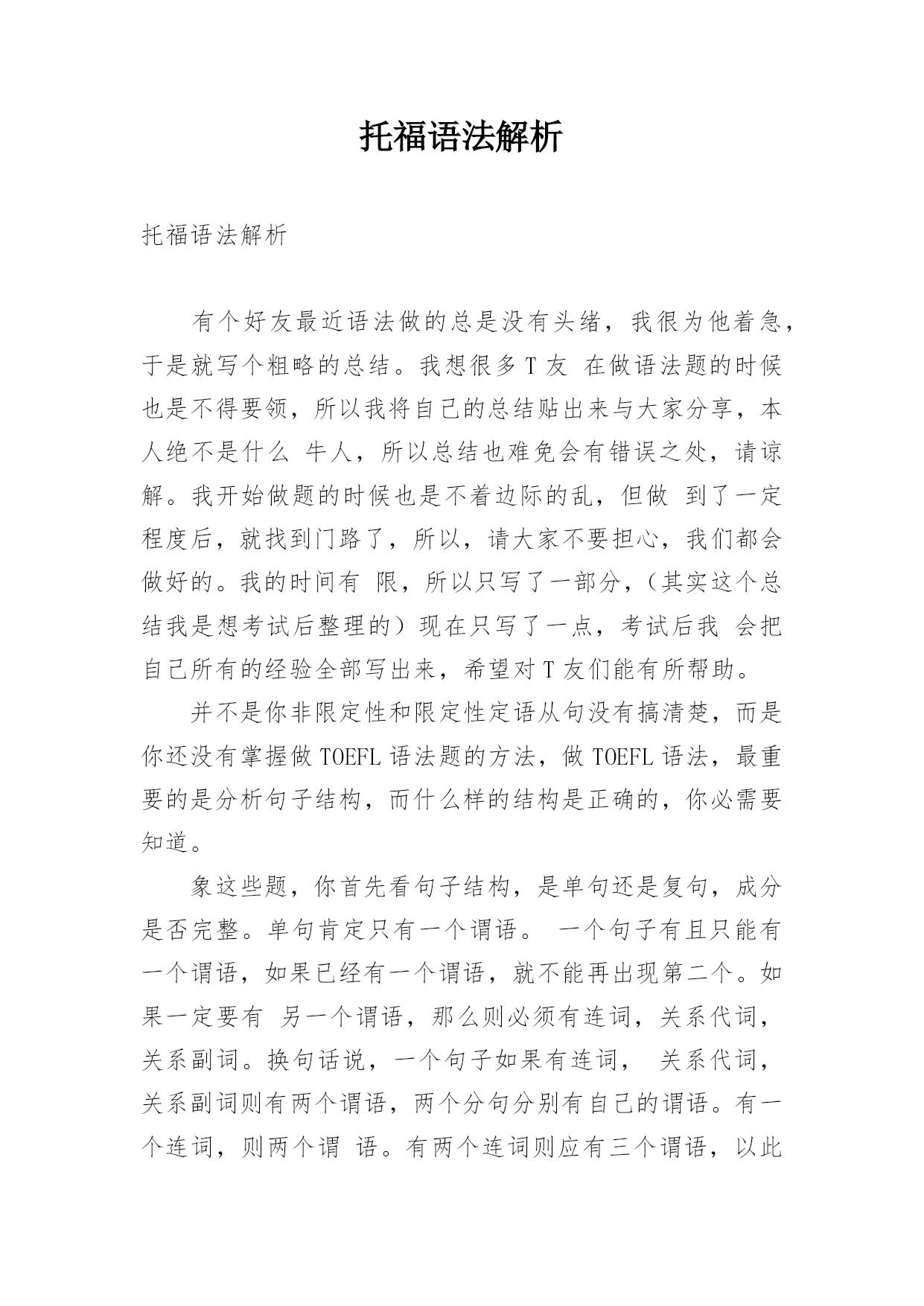 托福语法解析托福语法解析有个好友最近语法做的总是没有头绪,我很为他着急,于是就写个粗略的总结。我想很多T友在做语法题的时候也是不得要领,所以我将自己的总结贴出来与大家分享,本人绝不是什么牛人,所以总结也难免会有错误之处,请谅解。我开始做题的时候也是不着边际的乱,但做到了一定程度后,就找到门路了,所以,请大家不要担心,我们都会做好的。我的时间有限,所以只写了一部分,(其实这个总结我是想考试后整理的)现在只写了一点,考试后我会把自己所有的经验全部写出来,希望对T友们能有所帮助。并不是你非限定性和限定性定语从句