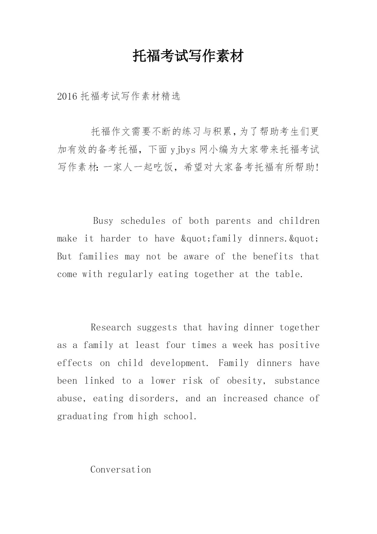 托福考试写作素材2016托福考试写作素材精选托福作文需要不断的练习与积累,为了帮助考生们更加有效的备考托福,下面yjbys网小编为大家带来托福考试写作素材:一家人一起吃饭,希望对大家备考托福有所帮助!Busyschedulesofbothparentsandchildrenmakeithardertohave"familydinners."Butfamiliesmaynotbeawareofthebenefitsthatcomewithregularlyeatingtogetherat