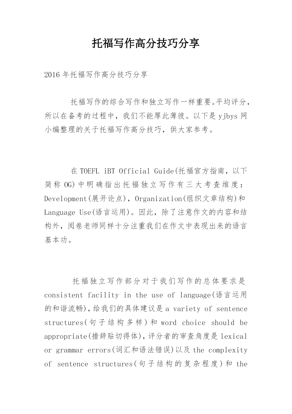 托福写作高分技巧分享2016年托福写作高分技巧分享托福写作的综合写作和独立写作一样重要。平均评分,所以在备考的过程中,我们不能厚此薄彼。以下是yjbys网小编整理的关于托福写作高分技巧,供大家参考。在TOEFLiBTOfficialGuide(托福官方指南,以下简称OG)中明确指出托福独立写作有三大考查维度:Development(展开论点),Organization(组织文章结构)和LanguageUse(语言运用)。因此,除了注意作文的内容和结构外,阅卷老师同样十分注重我们在作文中表现出来的语言基本功
