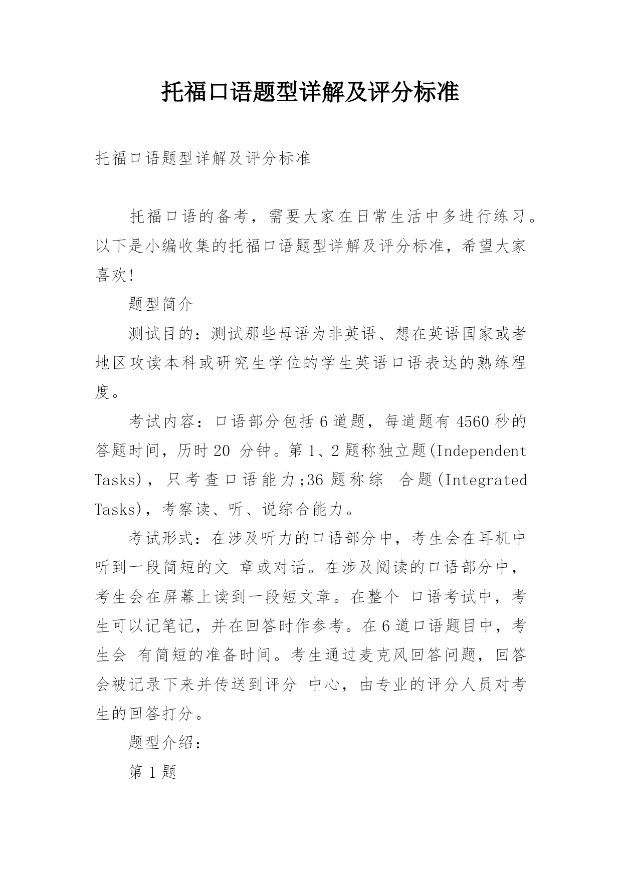 托福口语题型详解及评分标准托福口语题型详解及评分标准托福口语的备考,需要大家在日常生活中多进行练习。以下是小编收集的托福口语题型详解及评分标准,希望大家喜欢!题型简介测试目的:测试那些母语为非英语、想在英语国家或者地区攻读本科或研究生学位的学生英语口语表达的熟练程度。考试内容:口语部分包括6道题,每道题有4560秒的答题时间,历时20分钟。第1、2题称独立题(IndependentTasks),只考查口语能力;36题称综合题(IntegratedTasks),考察读、听、说综合能力。考试形式:在涉及听力的