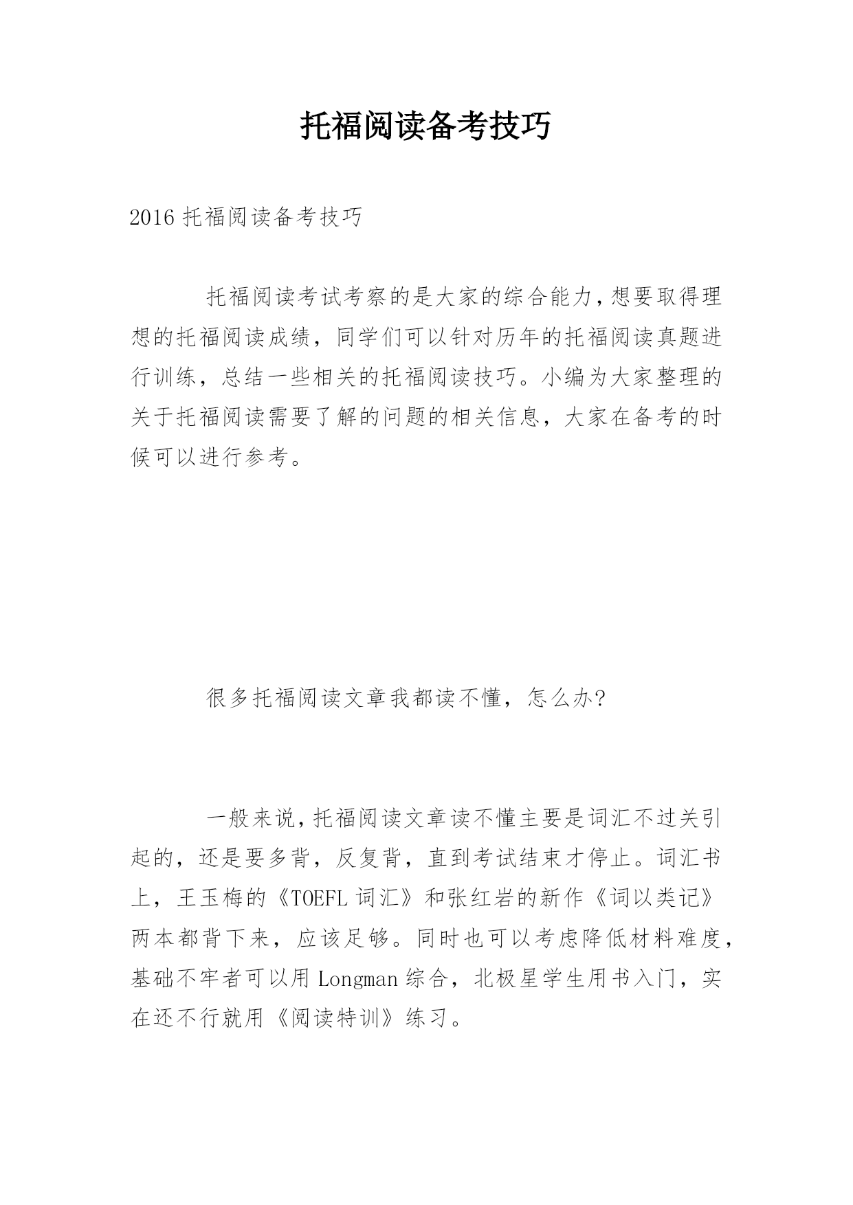 托福阅读备考技巧2016托福阅读备考技巧托福阅读考试考察的是大家的综合能力,想要取得理想的托福阅读成绩,同学们可以针对历年的托福阅读真题进行训练,总结一些相关的托福阅读技巧。小编为大家整理的关于托福阅读需要了解的问题的相关信息,大家在备考的时候可以进行参考。很多托福阅读文章我都读不懂,怎么办?一般来说,托福阅读文章读不懂主要是词汇不过关引起的,还是要多背,反复背,直到考试结束才停止。词汇书上,王玉梅的《TOEFL词汇》和张红岩的新作《词以类记》两本都背下来,应该足够。同时也可以考虑降低材料难度,基础不牢者