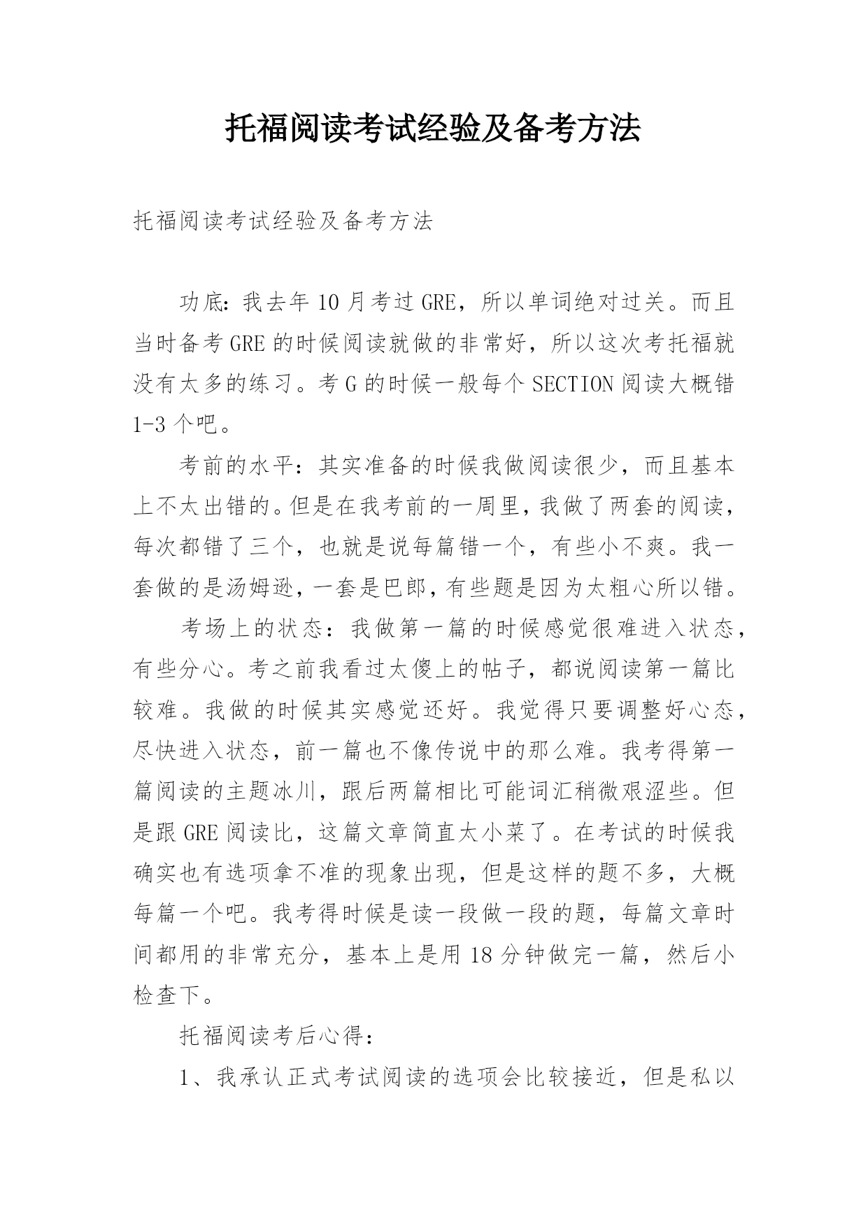 托福阅读考试经验及备考方法托福阅读考试经验及备考方法功底:我去年10月考过GRE,所以单词绝对过关。而且当时备考GRE的时候阅读就做的非常好,所以这次考托福就没有太多的练习。考G的时候一般每个SECTION阅读大概错1-3个吧。考前的水平:其实准备的时候我做阅读很少,而且基本上不太出错的。但是在我考前的一周里,我做了两套的阅读,每次都错了三个,也就是说每篇错一个,有些小不爽。我一套做的是汤姆逊,一套是巴郎,有些题是因为太粗心所以错。考场上的状态:我做第一篇的时候感觉很难进入状态,有些分心。考之前我看过太傻