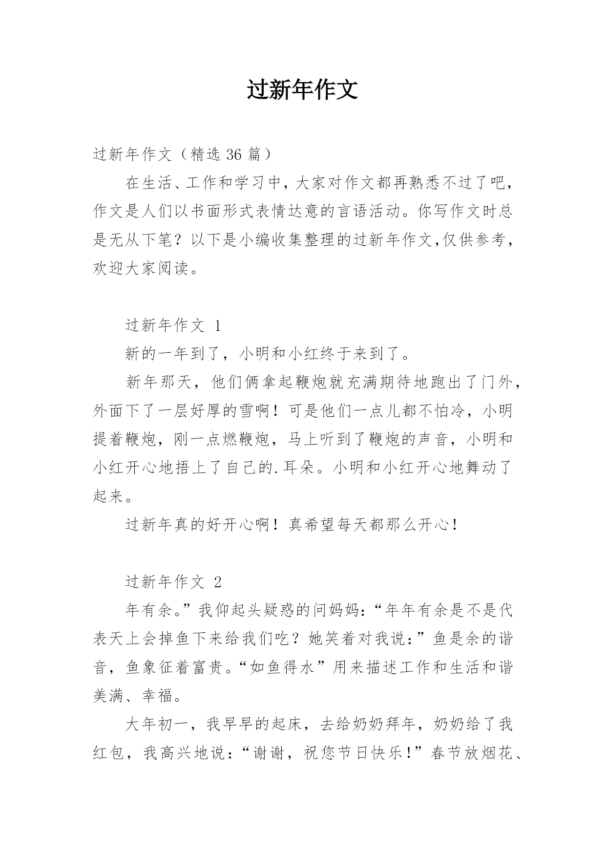 过新年作文过新年作文(精选36篇)在生活、工作和学习中,大家对作文都再熟悉不过了吧,作文是人们以书面形式表情达意的言语活动。你写作文时总是无从下笔?以下是小编收集整理的过新年作文,仅供参考,欢迎大家阅读。过新年作文1新的一年到了,小明和小红终于来到了。新年那天,他们俩拿起鞭炮就充满期待地跑出了门外,外面下了一层好厚的雪啊!可是他们一点儿都不怕冷,小明提着鞭炮,刚一点燃鞭炮,马上听到了鞭炮的声音,小明和小红开心地捂上了自己的.耳朵。小明和小红开心地舞动了起来。过新年真的好开心啊!真希望每天都那么开心!过新年