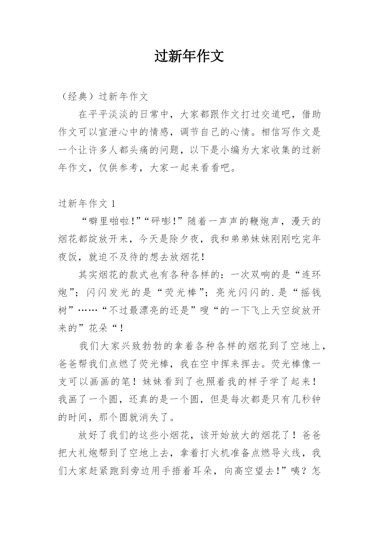 过新年作文(经典)过新年作文在平平淡淡的日常中,大家都跟作文打过交道吧,借助作文可以宣泄心中的情感,调节自己的心情。相信写作文是一个让许多人都头痛的问题,以下是小编为大家收集的过新年作文,仅供参考,大家一起来看看吧。过新年作文1“噼里啪啦!”“砰嘭!”随着一声声的鞭炮声,漫天的烟花都绽放开来,今天是除夕夜,我和弟弟妹妹刚刚吃完年夜饭,就迫不及待的想去放烟花!其实烟花的款式也有各种各样的:一次双响的是“连环炮”;闪闪发光的是“荧光棒”;亮光闪闪的.是“摇钱树”……“不过最漂亮的还是”嗖“的一下飞上天空绽放开