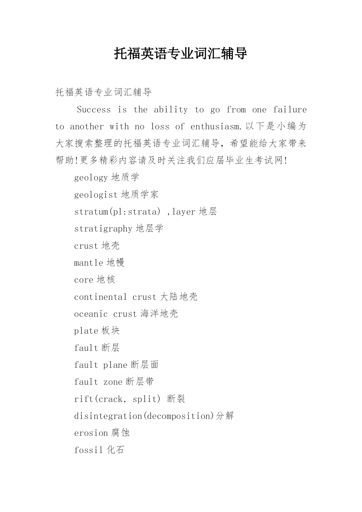 托福英语专业词汇辅导托福英语专业词汇辅导Successistheabilitytogofromonefailuretoanotherwithnolossofenthusiasm.以下是小编为大家搜索整理的托福英语专业词汇辅导,希望能给大家带来帮助!更多精彩内容请及时关注我们应届毕业生考试网!geology地质学geologist地质学家stratum(pl:strata),layer地层stratigraphy地层学crust地壳mantle地幔core地核continentalcrust大陆地壳ocea