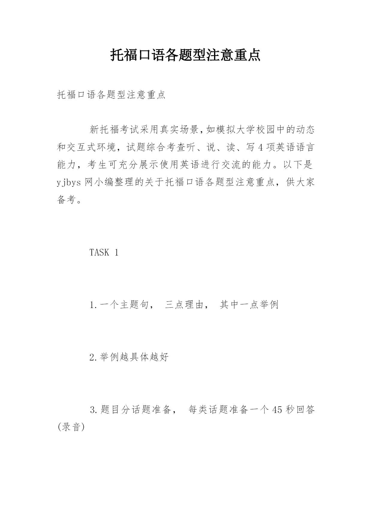 托福口语各题型注意重点托福口语各题型注意重点新托福考试采用真实场景,如模拟大学校园中的动态和交互式环境,试题综合考查听、说、读、写4项英语语言能力,考生可充分展示使用英语进行交流的能力。以下是yjbys网小编整理的关于托福口语各题型注意重点,供大家备考。TASK11.一个主题句,三点理由,其中一点举例2.举例越具体越好3.题目分话题准备,每类话题准备一个45秒回答(录音)TASK21.主题句表明倾向性,两点理由充分陈述2.其中一点理由加上A/B的优缺点比较3.结尾的Conclusionsentence不强