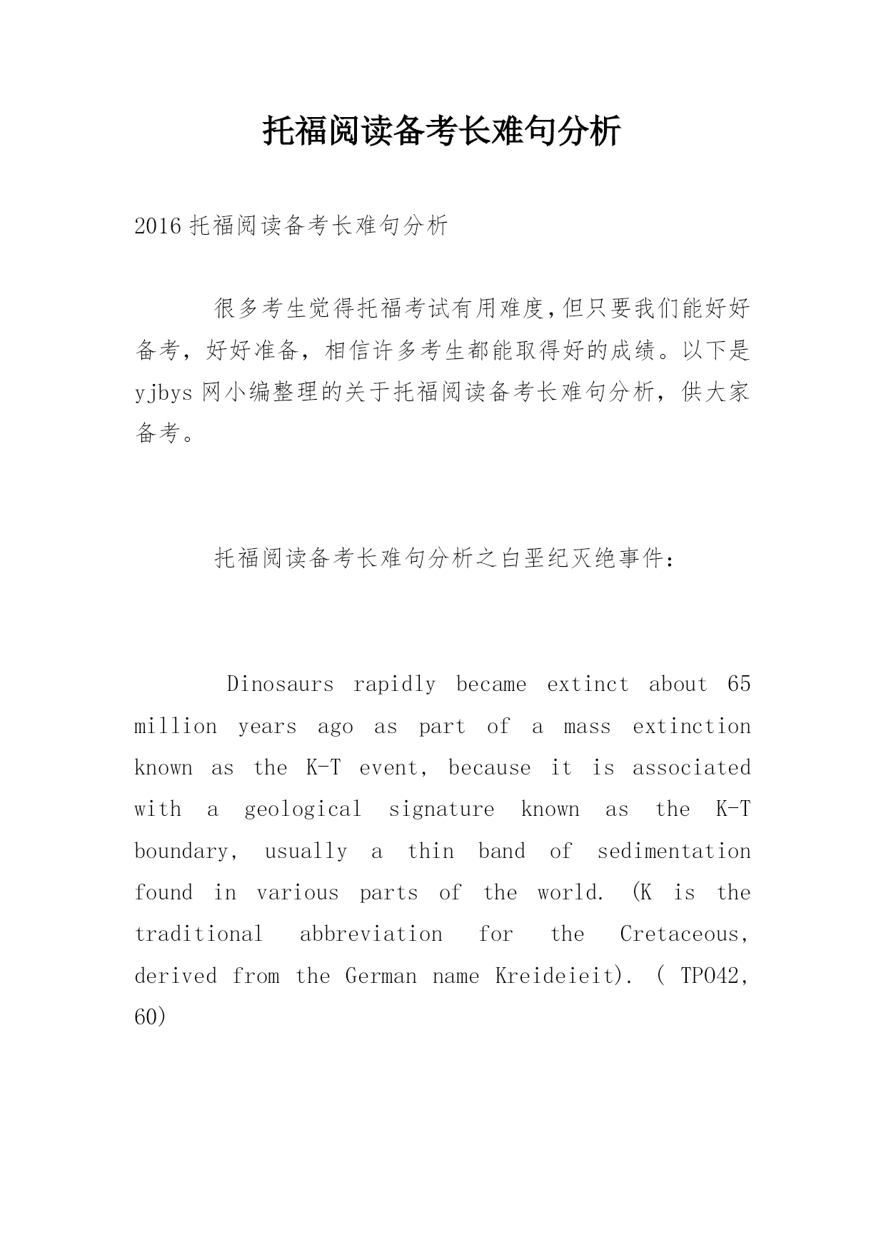 托福阅读备考长难句分析2016托福阅读备考长难句分析很多考生觉得托福考试有用难度,但只要我们能好好备考,好好准备,相信许多考生都能取得好的成绩。以下是yjbys网小编整理的关于托福阅读备考长难句分析,供大家备考。托福阅读备考长难句分析之白垩纪灭绝事件:Dinosaursrapidlybecameextinctabout65millionyearsagoaspartofamassextinctionknownastheK-Tevent,becauseitisassociatedwithageological