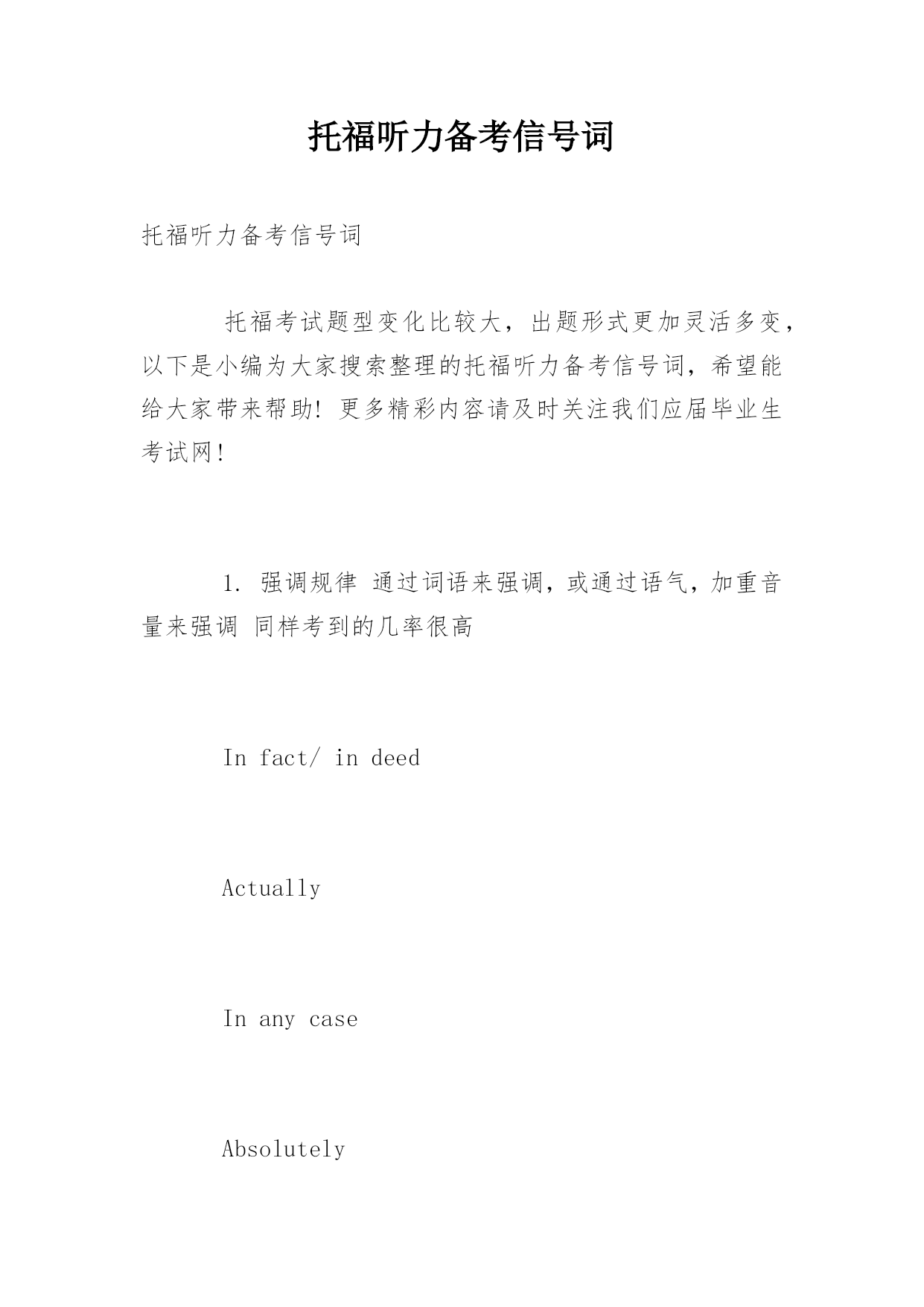 托福听力备考信号词托福听力备考信号词托福考试题型变化比较大,出题形式更加灵活多变,以下是小编为大家搜索整理的托福听力备考信号词,希望能给大家带来帮助!更多精彩内容请及时关注我们应届毕业生考试网!1.强调规律通过词语来强调,或通过语气,加重音量来强调同样考到的几率很高Infact/indeedActuallyInanycaseAbsolutelyAndthemostimportantis…Now,thisisveryimportant…Amajorpointis…T