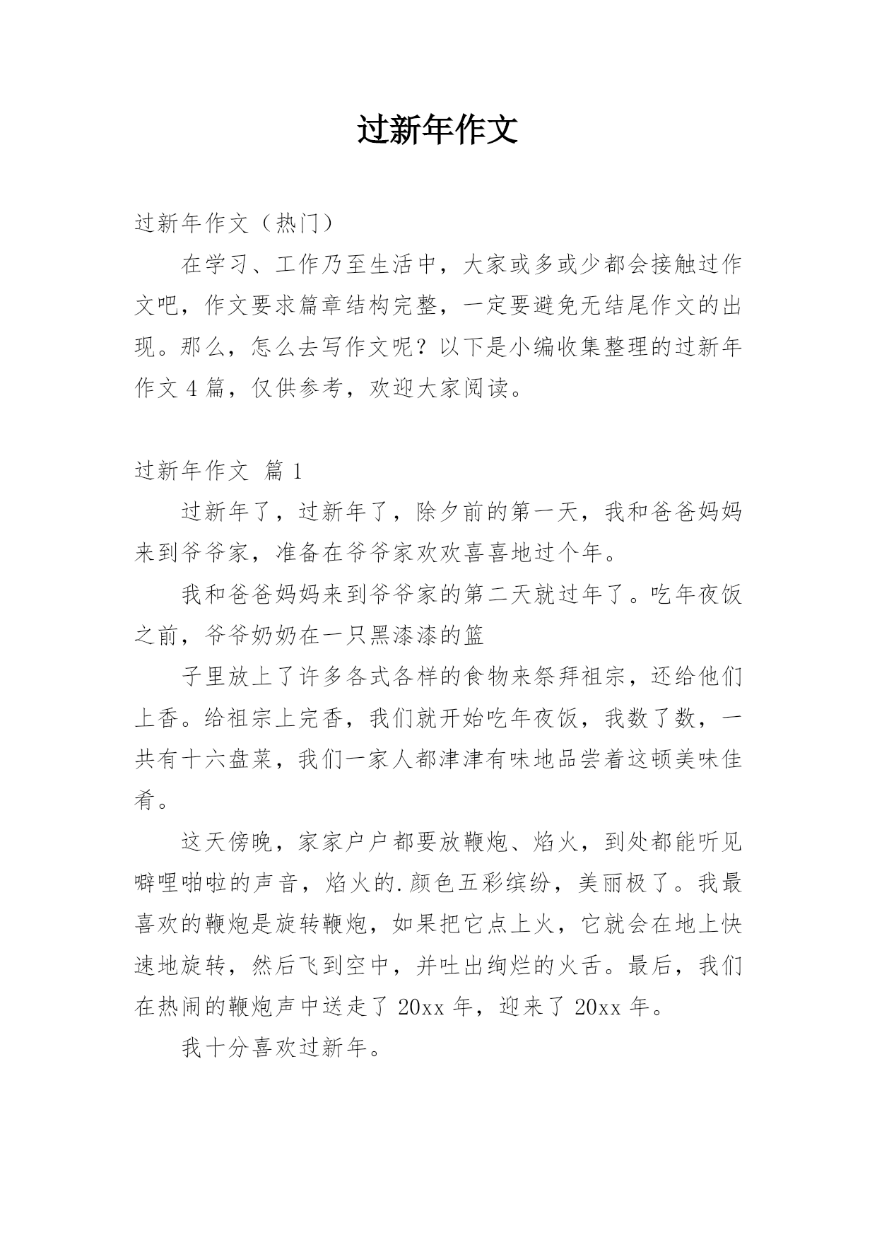 过新年作文过新年作文(热门)在学习、工作乃至生活中,大家或多或少都会接触过作文吧,作文要求篇章结构完整,一定要避免无结尾作文的出现。那么,怎么去写作文呢?以下是小编收集整理的过新年作文4篇,仅供参考,欢迎大家阅读。过新年作文篇1过新年了,过新年了,除夕前的第一天,我和爸爸妈妈来到爷爷家,准备在爷爷家欢欢喜喜地过个年。我和爸爸妈妈来到爷爷家的第二天就过年了。吃年夜饭之前,爷爷奶奶在一只黑漆漆的篮子里放上了许多各式各样的食物来祭拜祖宗,还给他们上香。给祖宗上完香,我们就开始吃年夜饭,我数了数,一共有十六盘菜,