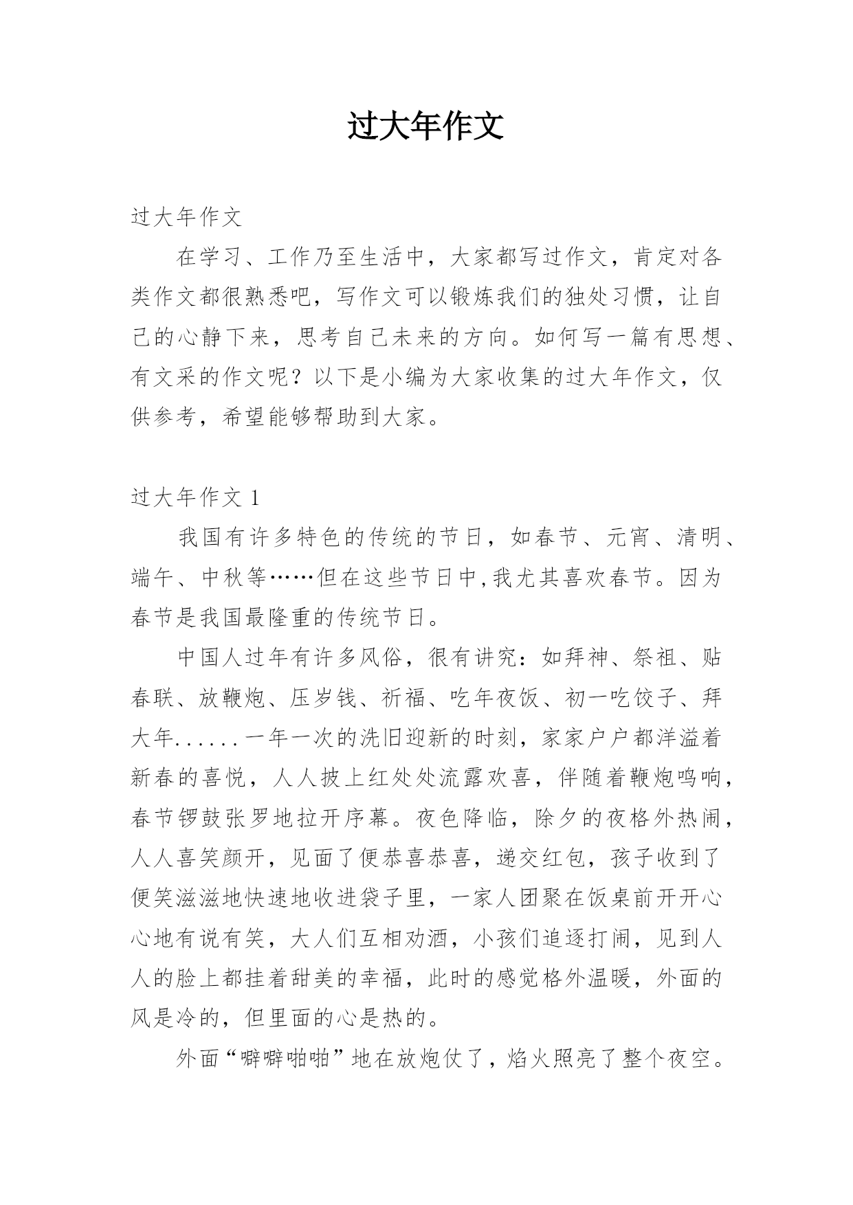 过大年作文过大年作文在学习、工作乃至生活中,大家都写过作文,肯定对各类作文都很熟悉吧,写作文可以锻炼我们的独处习惯,让自己的心静下来,思考自己未来的方向。如何写一篇有思想、有文采的作文呢?以下是小编为大家收集的过大年作文,仅供参考,希望能够帮助到大家。过大年作文1我国有许多特色的传统的节日,如春节、元宵、清明、端午、中秋等……但在这些节日中,我尤其喜欢春节。因为春节是我国最隆重的传统节日。中国人过年有许多风俗,很有讲究:如拜神、祭祖、贴春联、放鞭炮、压岁钱、祈福、吃年夜饭、初一吃饺子、拜大年......一