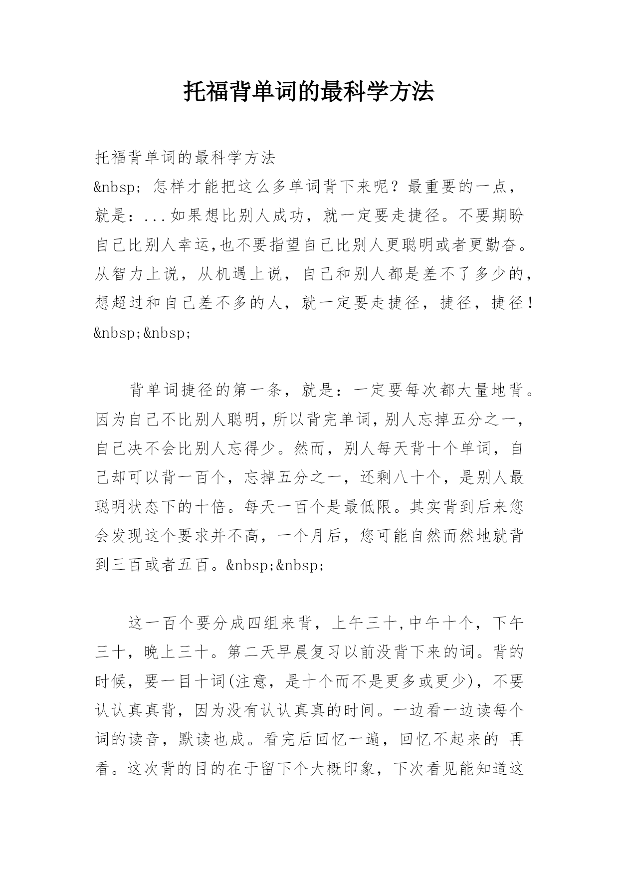 托福背单词的最科学方法托福背单词的最科学方法 怎样才能把这么多单词背下来呢?最重要的一点,就是:...如果想比别人成功,就一定要走捷径。不要期盼自己比别人幸运,也不要指望自己比别人更聪明或者更勤奋。从智力上说,从机遇上说,自己和别人都是差不了多少的,想超过和自己差不多的人,就一定要走捷径,捷径,捷径! 背单词捷径的第一条,就是:一定要每次都大量地背。因为自己不比别人聪明,所以背完单词,别人忘掉五分之一,自己决不会比别人忘得少。然而,别人每天背十个单词,自己却可以背一百个,忘