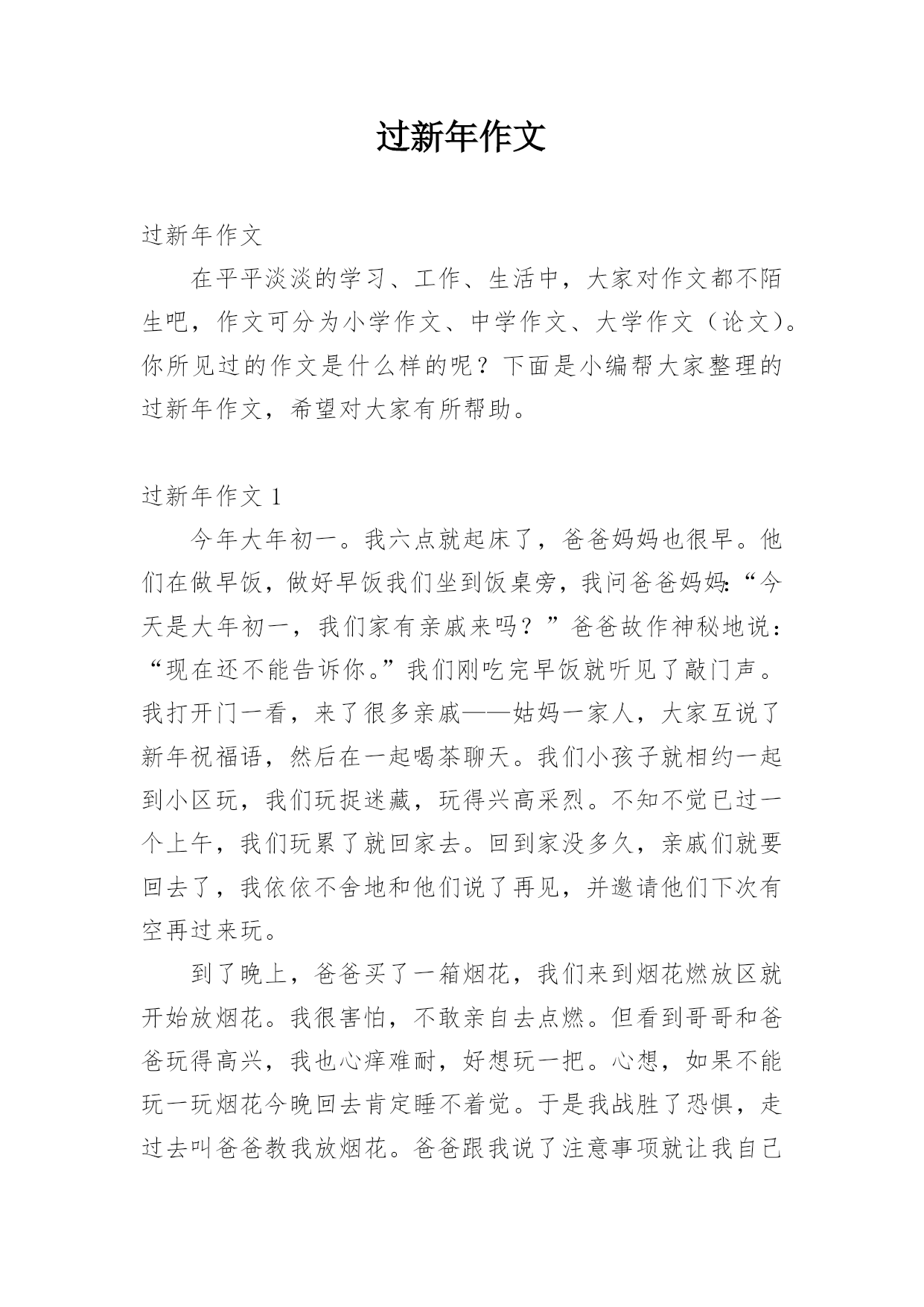 过新年作文过新年作文在平平淡淡的学习、工作、生活中,大家对作文都不陌生吧,作文可分为小学作文、中学作文、大学作文(论文)。你所见过的作文是什么样的呢?下面是小编帮大家整理的过新年作文,希望对大家有所帮助。过新年作文1今年大年初一。我六点就起床了,爸爸妈妈也很早。他们在做早饭,做好早饭我们坐到饭桌旁,我问爸爸妈妈:“今天是大年初一,我们家有亲戚来吗?”爸爸故作神秘地说:“现在还不能告诉你。”我们刚吃完早饭就听见了敲门声。我打开门一看,来了很多亲戚——姑妈一家人,大家互说了新年祝福语,然后在一起喝茶聊天。我们