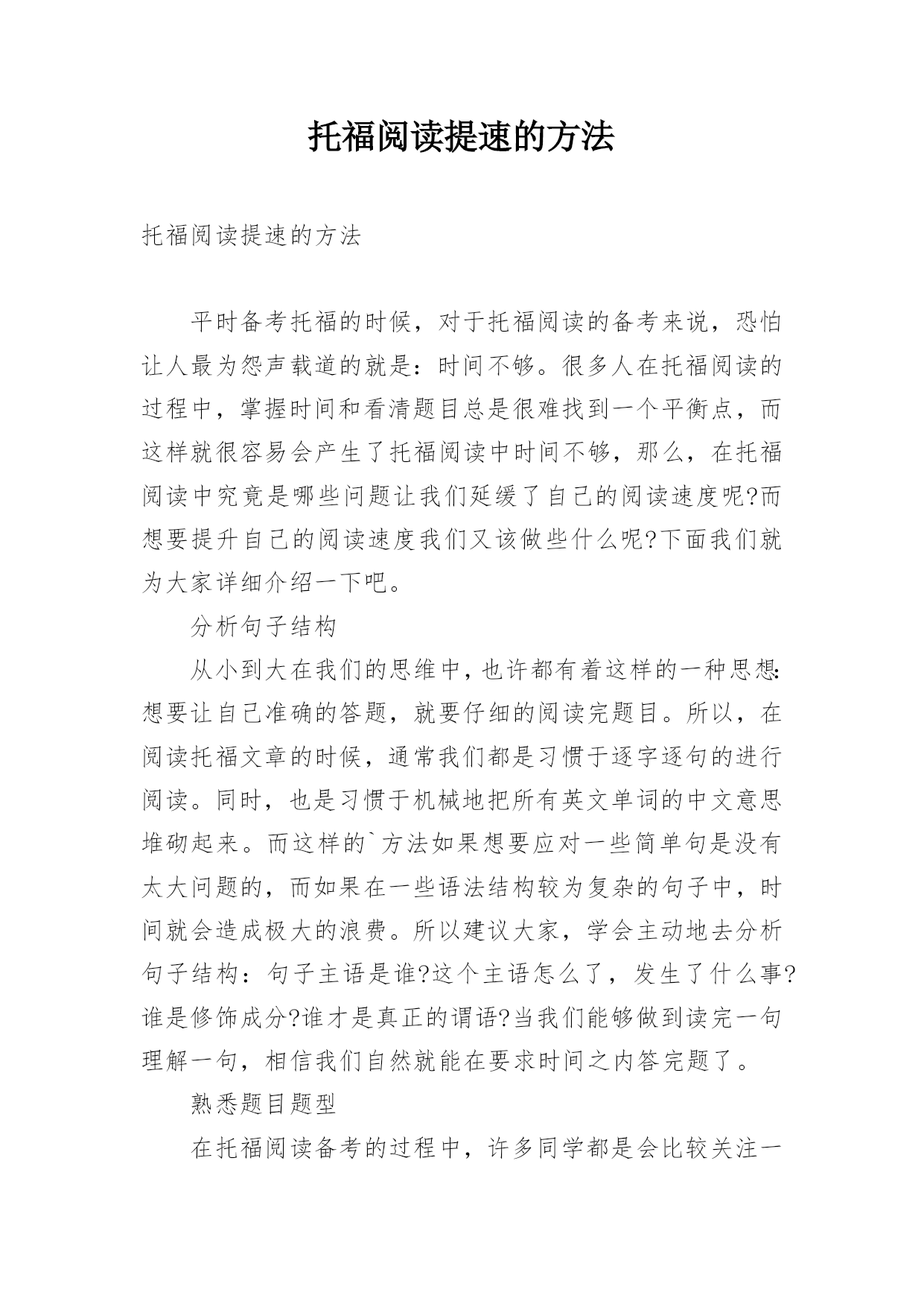 托福阅读提速的方法托福阅读提速的方法平时备考托福的时候,对于托福阅读的备考来说,恐怕让人最为怨声载道的就是:时间不够。很多人在托福阅读的过程中,掌握时间和看清题目总是很难找到一个平衡点,而这样就很容易会产生了托福阅读中时间不够,那么,在托福阅读中究竟是哪些问题让我们延缓了自己的阅读速度呢?而想要提升自己的阅读速度我们又该做些什么呢?下面我们就为大家详细介绍一下吧。分析句子结构从小到大在我们的思维中,也许都有着这样的一种思想:想要让自己准确的答题,就要仔细的阅读完题目。所以,在阅读托福文章的时候,通常我们都