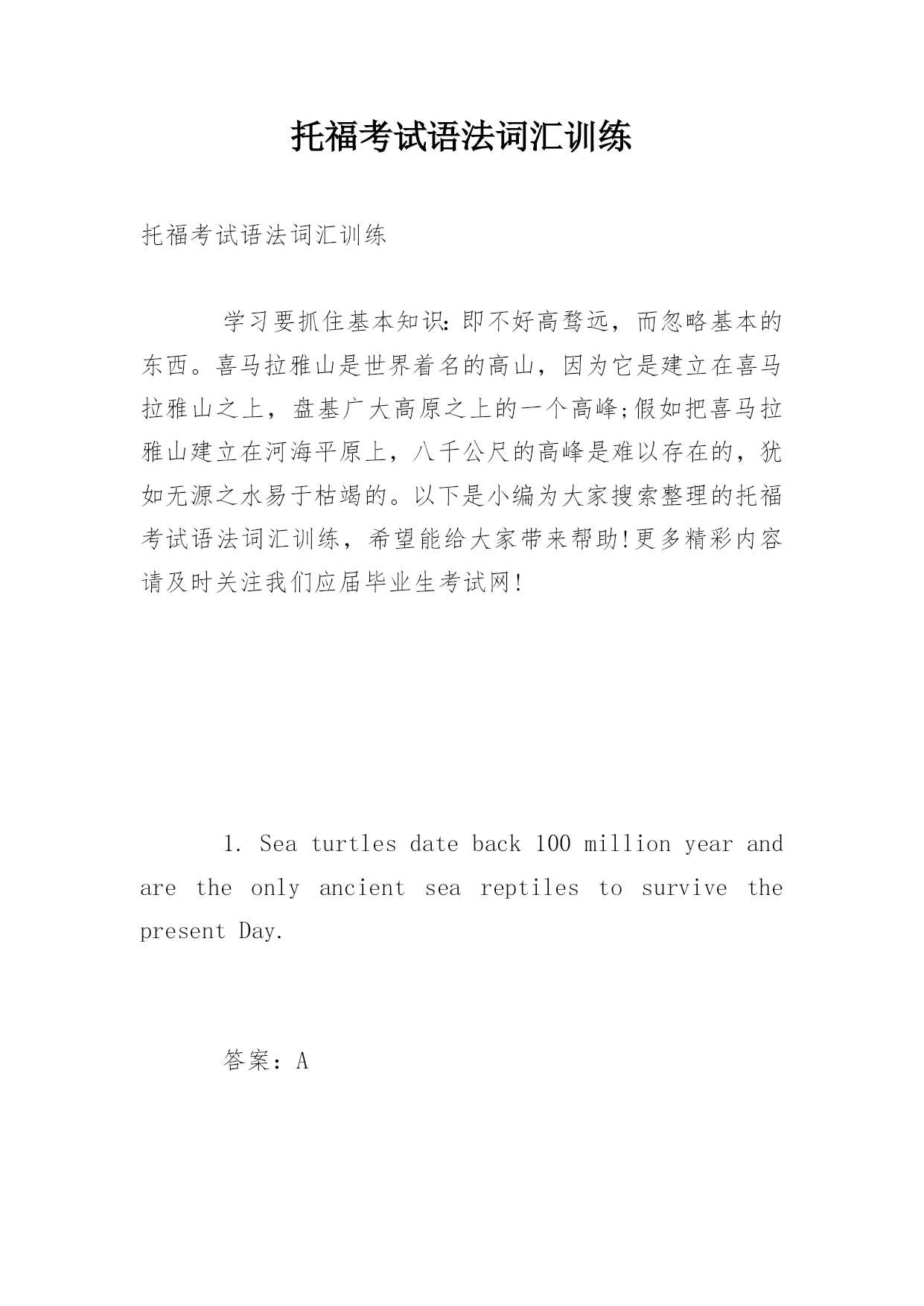 托福考试语法词汇训练托福考试语法词汇训练学习要抓住基本知识:即不好高骛远,而忽略基本的东西。喜马拉雅山是世界着名的高山,因为它是建立在喜马拉雅山之上,盘基广大高原之上的一个高峰;假如把喜马拉雅山建立在河海平原上,八千公尺的高峰是难以存在的,犹如无源之水易于枯竭的。以下是小编为大家搜索整理的托福考试语法词汇训练,希望能给大家带来帮助!更多精彩内容请及时关注我们应届毕业生考试网!1.Seaturtlesdateback100millionyearandaretheonlyancientseareptilest