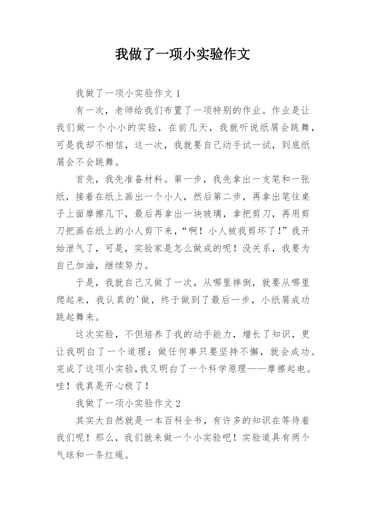 我做了一项小实验作文我做了一项小实验作文1有一次,老师给我们布置了一项特别的作业。作业是让我们做一个小小的实验,在前几天,我就听说纸屑会跳舞,可是我却不相信,这一次,我就要自己动手试一试,到底纸屑会不会跳舞。首先,我先准备材料。第一步,我先拿出一支笔和一张纸,接着在纸上画出一个小人,然后第二步,再拿出笔往桌子上面摩擦几下,最后再拿出一块玻璃,拿把剪刀,再用剪刀把画在纸上的小人剪下来,“啊!小人被我剪坏了!”我开始泄气了,可是,实验家是怎么做成的呢!没关系,我要为自己加油,继续努力。于是,我就自己又做了一次