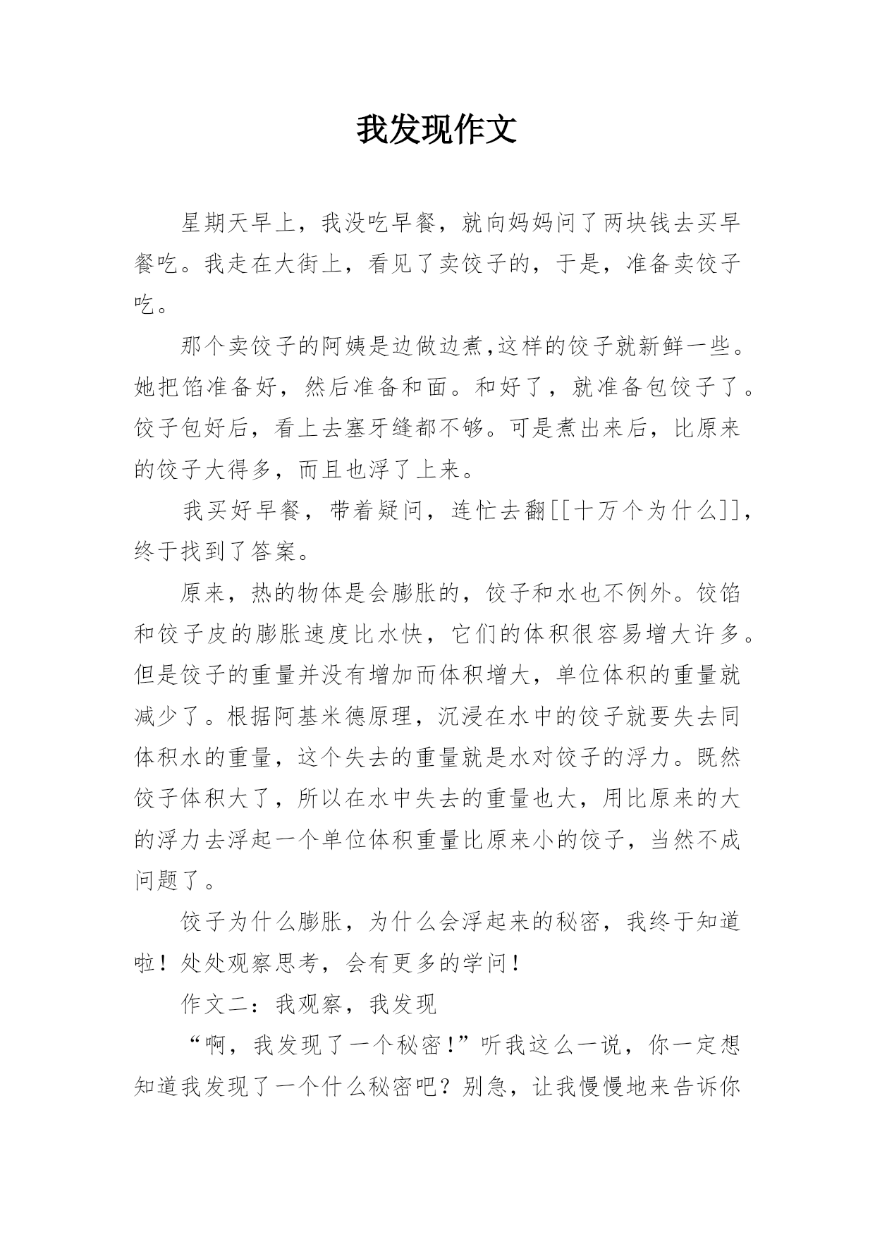我发现作文星期天早上,我没吃早餐,就向妈妈问了两块钱去买早餐吃。我走在大街上,看见了卖饺子的,于是,准备卖饺子吃。那个卖饺子的阿姨是边做边煮,这样的饺子就新鲜一些。她把馅准备好,然后准备和面。和好了,就准备包饺子了。饺子包好后,看上去塞牙缝都不够。可是煮出来后,比原来的饺子大得多,而且也浮了上来。我买好早餐,带着疑问,连忙去翻[[十万个为什么]],终于找到了答案。原来,热的物体是会膨胀的,饺子和水也不例外。饺馅和饺子皮的膨胀速度比水快,它们的体积很容易增大许多。但是饺子的重量并没有增加而体积增大,单位体积