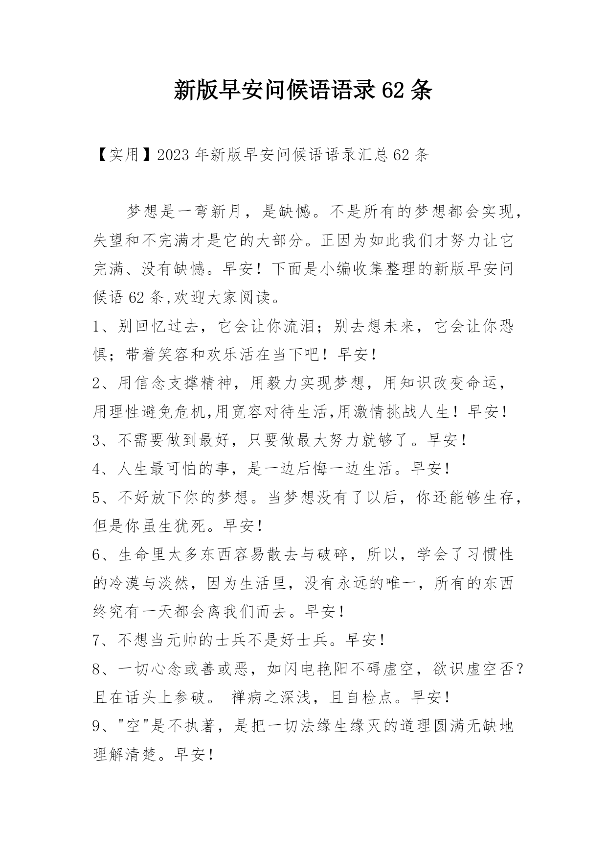 新版早安问候语语录62条【实用】2023年新版早安问候语语录汇总62条梦想是一弯新月,是缺憾。不是所有的梦想都会实现,失望和不完满才是它的大部分。正因为如此我们才努力让它完满、没有缺憾。早安!下面是小编收集整理的新版早安问候语62条,欢迎大家阅读。1、别回忆过去,它会让你流泪;别去想未来,它会让你恐惧;带着笑容和欢乐活在当下吧!早安!2、用信念支撑精神,用毅力实现梦想,用知识改变命运,用理性避免危机,用宽容对待生活,用激情挑战人生!早安!3、不需要做到最好,只要做最大努力就够了。早安!4、人生最可怕的事,