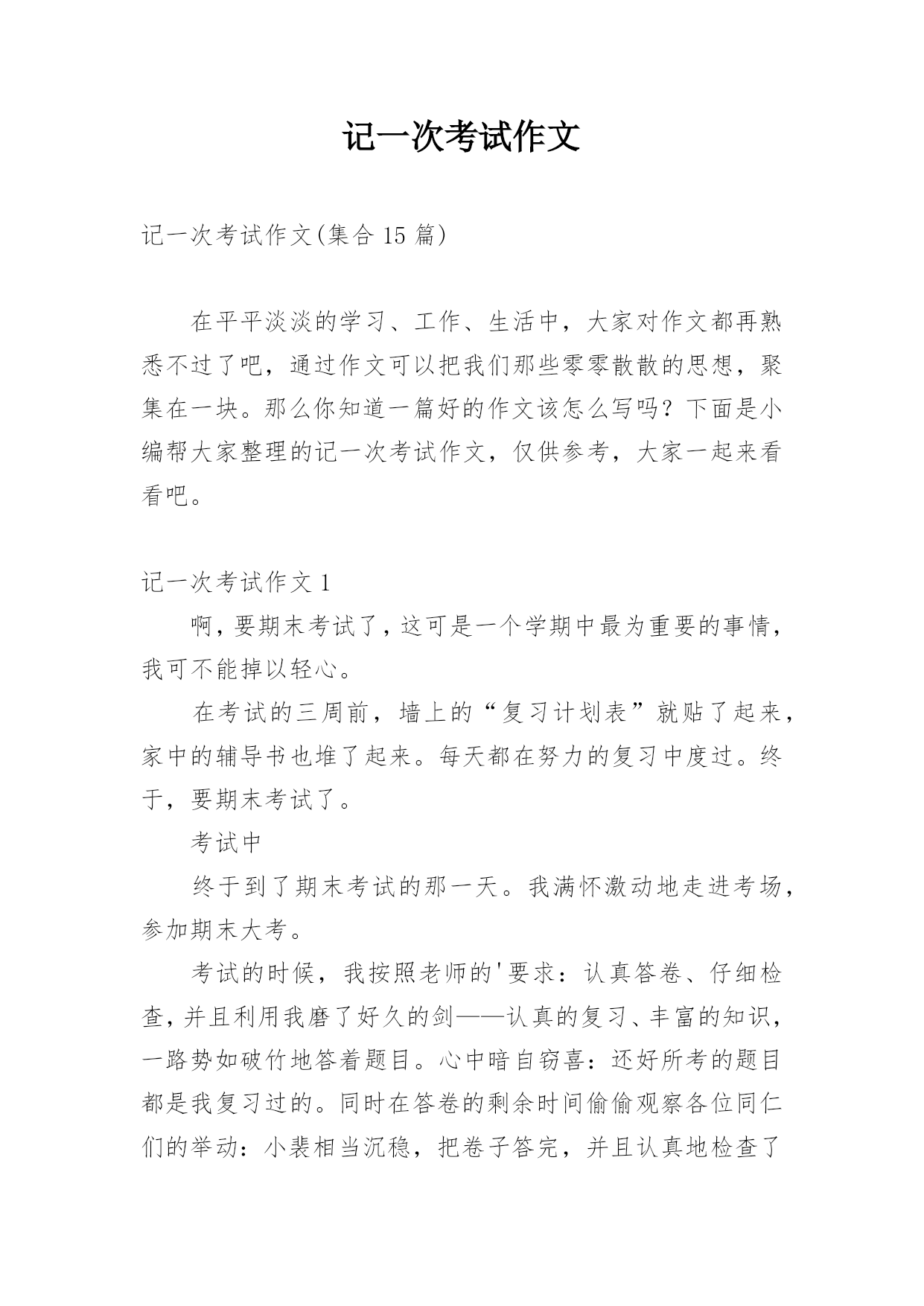 记一次考试作文记一次考试作文(集合15篇)在平平淡淡的学习、工作、生活中,大家对作文都再熟悉不过了吧,通过作文可以把我们那些零零散散的思想,聚集在一块。那么你知道一篇好的作文该怎么写吗?下面是小编帮大家整理的记一次考试作文,仅供参考,大家一起来看看吧。记一次考试作文1啊,要期末考试了,这可是一个学期中最为重要的事情,我可不能掉以轻心。在考试的三周前,墙上的“复习计划表”就贴了起来,家中的辅导书也堆了起来。每天都在努力的复习中度过。终于,要期末考试了。考试中终于到了期末考试的那一天。我满怀激动地走进考场,参