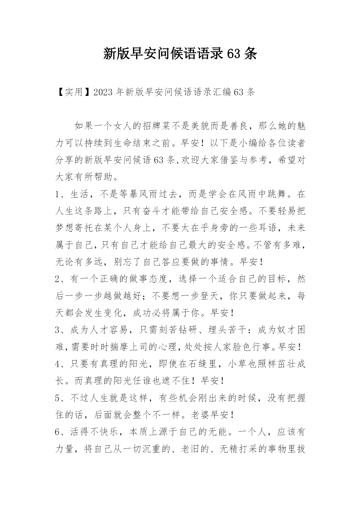 新版早安问候语语录63条【实用】2023年新版早安问候语语录汇编63条如果一个女人的招牌菜不是美貌而是善良,那么她的魅力可以持续到生命结束之前。早安!以下是小编给各位读者分享的新版早安问候语63条,欢迎大家借鉴与参考,希望对大家有所帮助。1、生活,不是等暴风雨过去,而是学会在风雨中跳舞。在人生这条路上,只有奋斗才能带给自己安全感。不要轻易把梦想寄托在某个人身上,不要太在乎身旁的一些耳语,未来属于自己,只有自己才能给自己最大的安全感。不管有多难,无论有多远,别忘了自己答应要做的事情。早安!2、有一个正确的做
