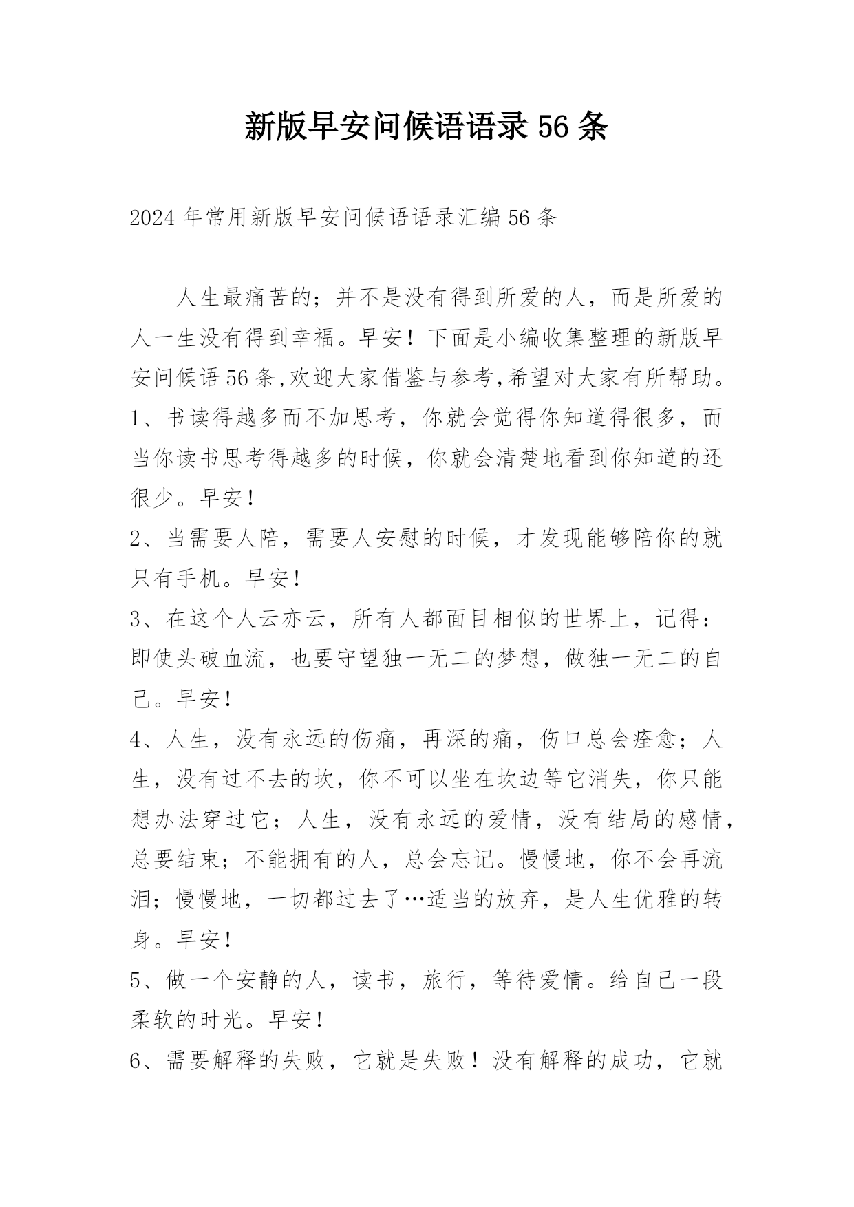 新版早安问候语语录56条2024年常用新版早安问候语语录汇编56条人生最痛苦的;并不是没有得到所爱的人,而是所爱的人一生没有得到幸福。早安!下面是小编收集整理的新版早安问候语56条,欢迎大家借鉴与参考,希望对大家有所帮助。1、书读得越多而不加思考,你就会觉得你知道得很多,而当你读书思考得越多的时候,你就会清楚地看到你知道的还很少。早安!2、当需要人陪,需要人安慰的时候,才发现能够陪你的就只有手机。早安!3、在这个人云亦云,所有人都面目相似的世界上,记得:即使头破血流,也要守望独一无二的梦想,做独一无二的自