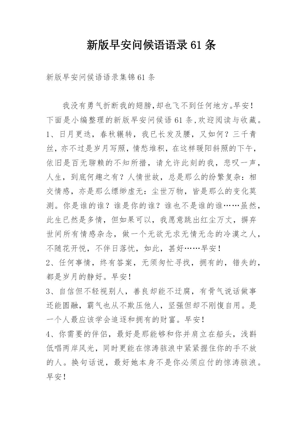 新版早安问候语语录59条【推荐】新版早安问候语语录59条如果清风有情,那么明月可鉴;如果落花有情,那么流水可懂;如果流星有情,那么星空可睹。抹不去的,是幽幽萦绕的孤单;解不开的,是袅袅缠绕的前缘;斩不断的,是缕缕交织的思念;转不出的,是汩汩而逝的流年。早安~下面是小编为大家推荐的新版早安问候语59条,感兴趣的一起来看看吧。1、不因成功而忘乎所以,不因平淡而放松要求,不因挫折而丧失斗志。早安!2、人际关系的黄金法则:你希望别人如何对待你,你就如何对待别人。早安!3、上帝给了你智慧,磨难也如影随形。只有在磨难