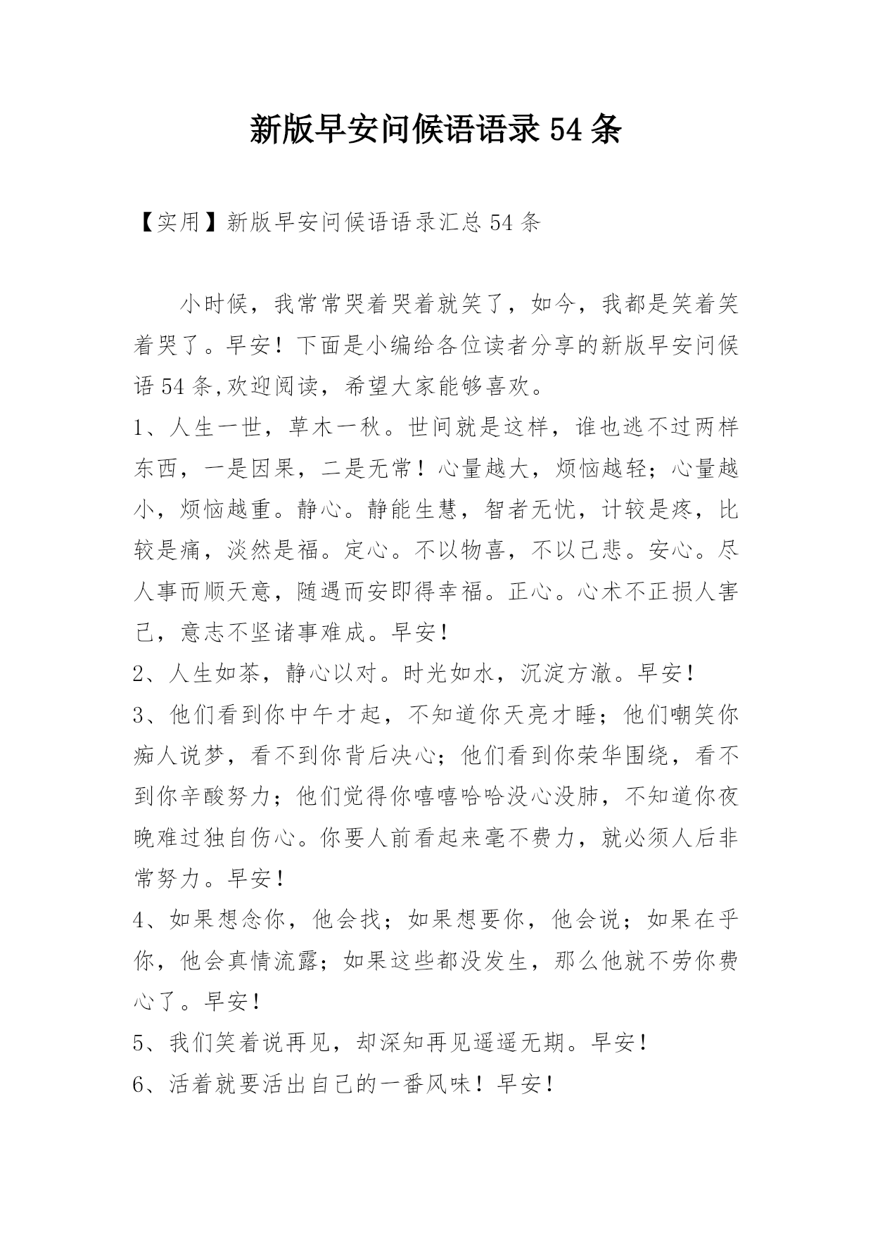 新版早安问候语语录54条【实用】新版早安问候语语录汇总54条小时候,我常常哭着哭着就笑了,如今,我都是笑着笑着哭了。早安!下面是小编给各位读者分享的新版早安问候语54条,欢迎阅读,希望大家能够喜欢。1、人生一世,草木一秋。世间就是这样,谁也逃不过两样东西,一是因果,二是无常!心量越大,烦恼越轻;心量越小,烦恼越重。静心。静能生慧,智者无忧,计较是疼,比较是痛,淡然是福。定心。不以物喜,不以己悲。安心。尽人事而顺天意,随遇而安即得幸福。正心。心术不正损人害己,意志不坚诸事难成。早安!2、人生如茶,静心以对。