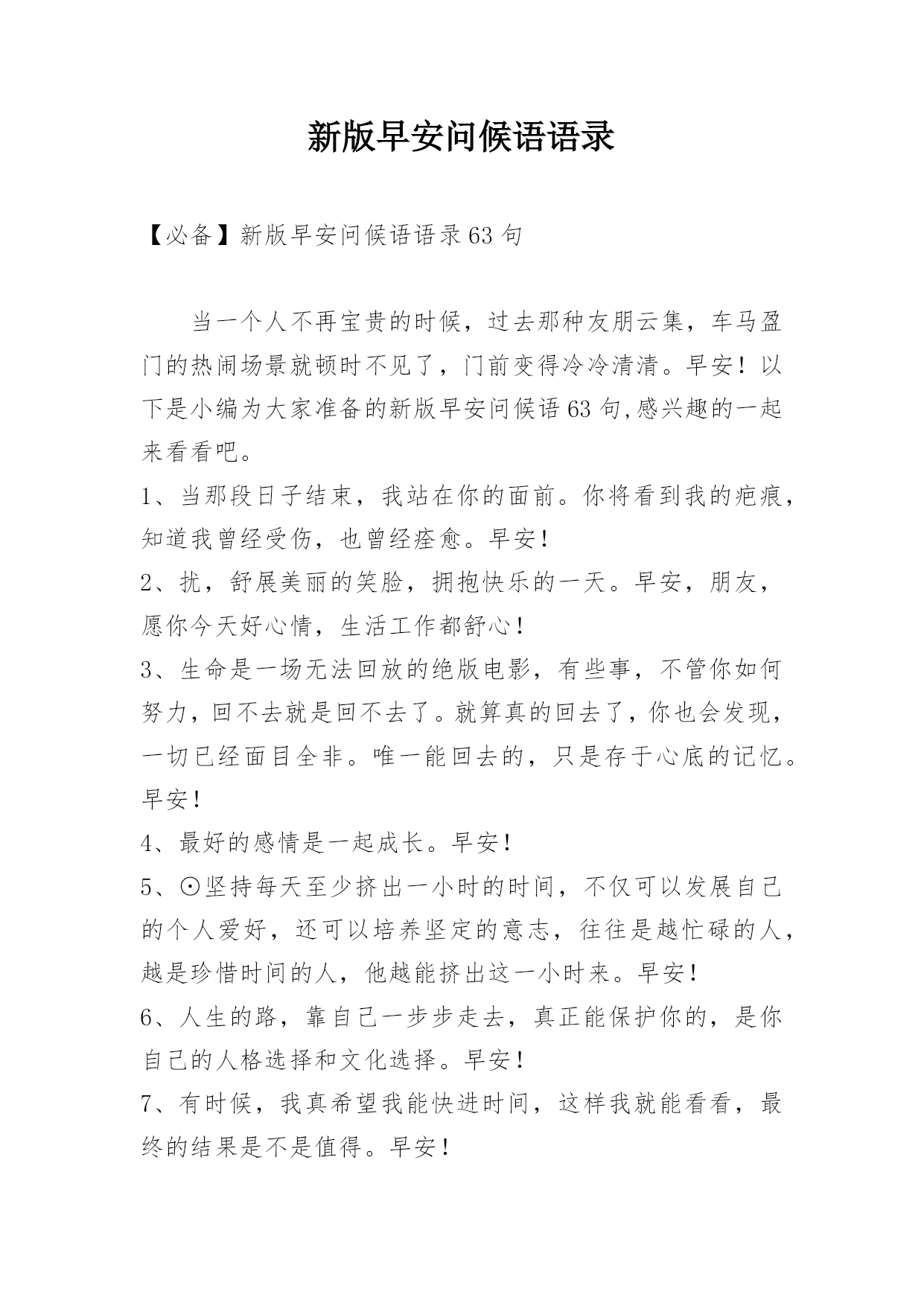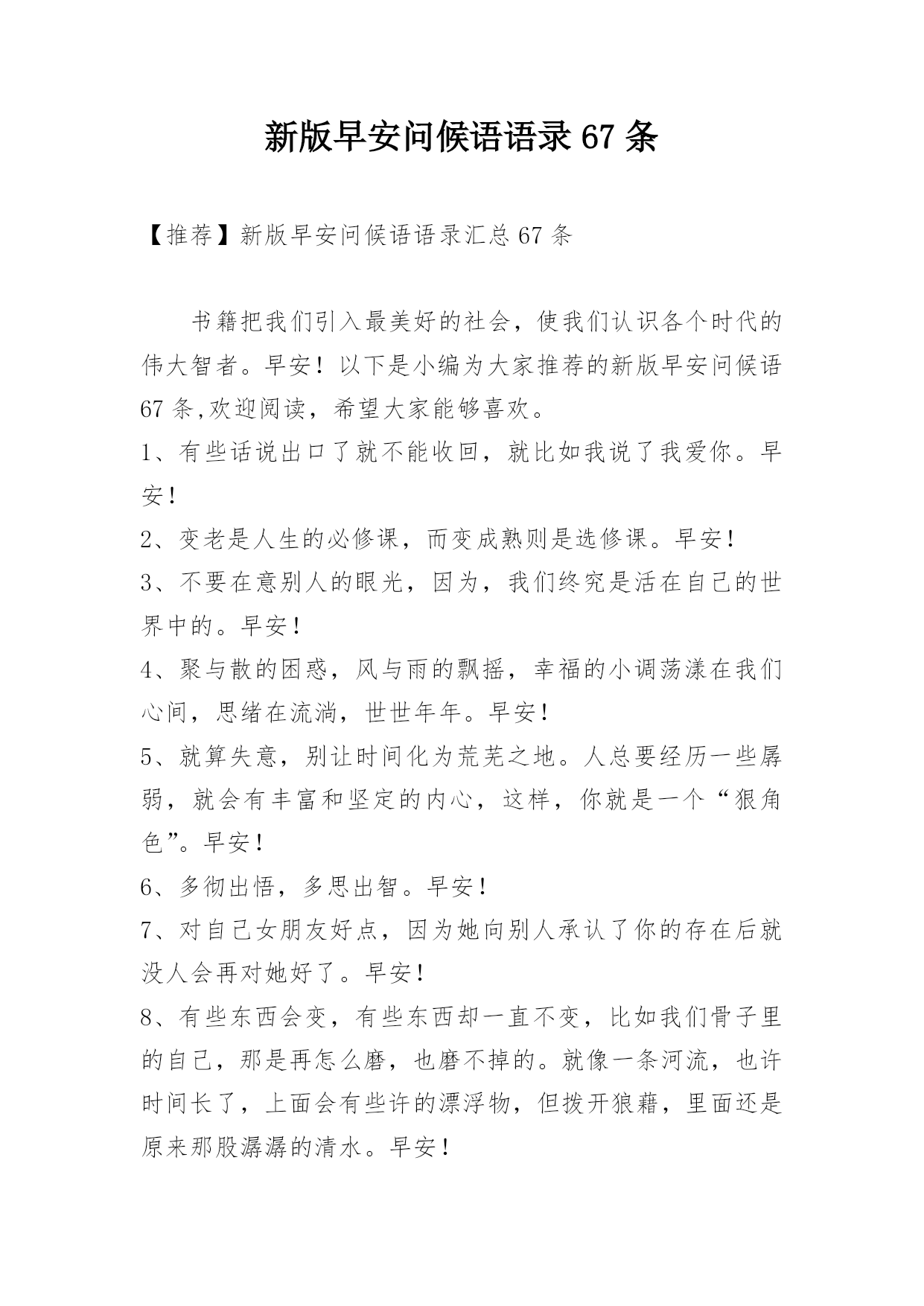 新版早安问候语语录67条【推荐】新版早安问候语语录汇总67条书籍把我们引入最美好的社会,使我们认识各个时代的伟大智者。早安!以下是小编为大家推荐的新版早安问候语67条,欢迎阅读,希望大家能够喜欢。1、有些话说出口了就不能收回,就比如我说了我爱你。早安!2、变老是人生的必修课,而变成熟则是选修课。早安!3、不要在意别人的眼光,因为,我们终究是活在自己的世界中的。早安!4、聚与散的困惑,风与雨的飘摇,幸福的小调荡漾在我们心间,思绪在流淌,世世年年。早安!5、就算失意,别让时间化为荒芜之地。人总要经历一些孱弱,