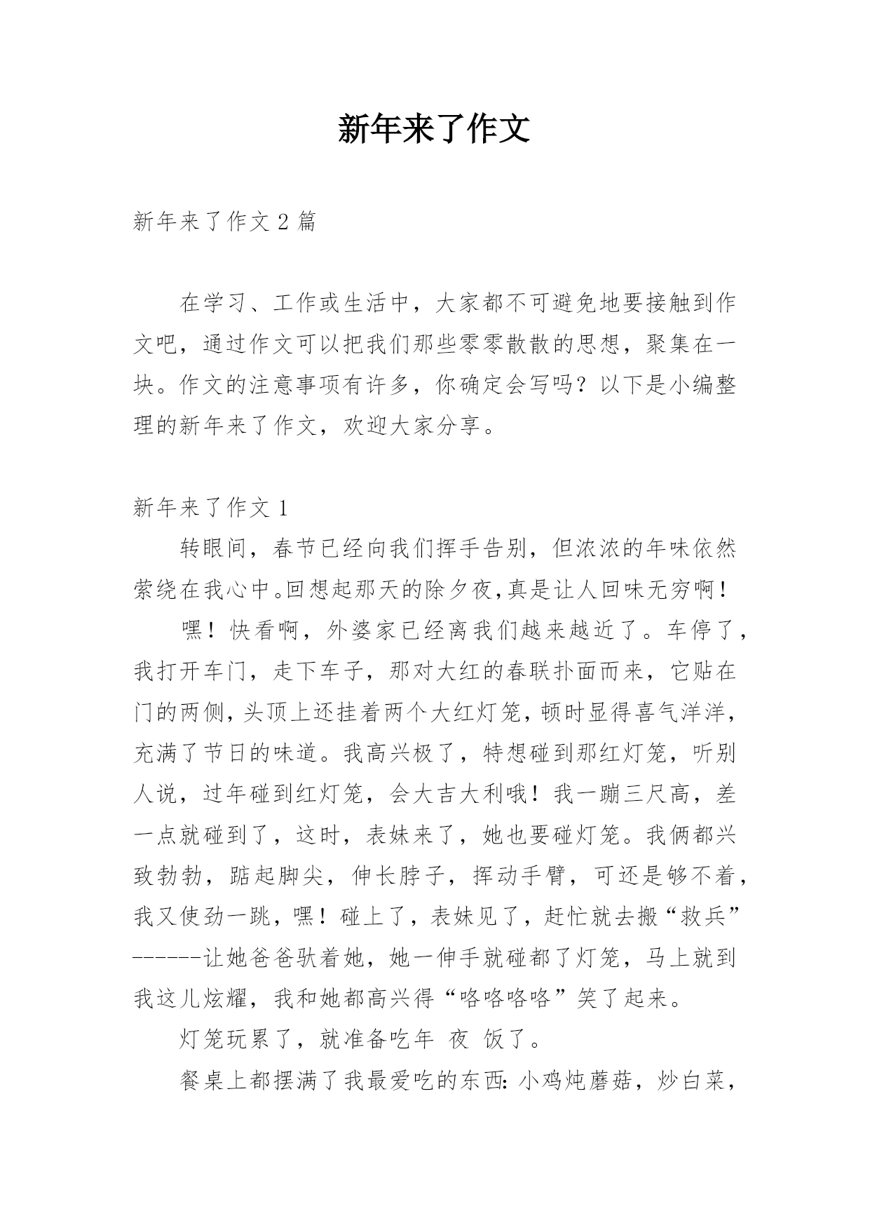 新年来了作文新年来了作文2篇在学习、工作或生活中,大家都不可避免地要接触到作文吧,通过作文可以把我们那些零零散散的思想,聚集在一块。作文的注意事项有许多,你确定会写吗?以下是小编整理的新年来了作文,欢迎大家分享。新年来了作文1转眼间,春节已经向我们挥手告别,但浓浓的年味依然萦绕在我心中。回想起那天的除夕夜,真是让人回味无穷啊!嘿!快看啊,外婆家已经离我们越来越近了。车停了,我打开车门,走下车子,那对大红的春联扑面而来,它贴在门的两侧,头顶上还挂着两个大红灯笼,顿时显得喜气洋洋,充满了节日的味道。我高兴极了