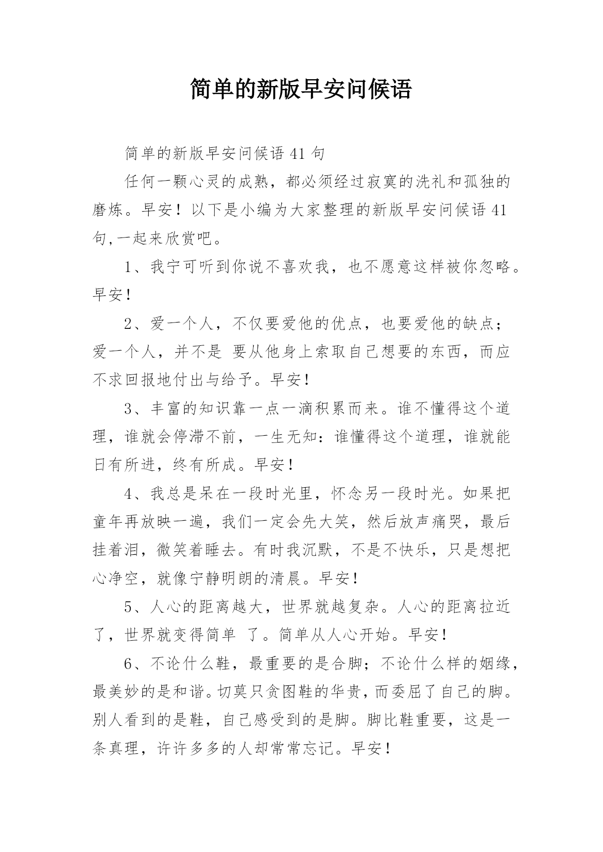 简单的新版早安问候语简单的新版早安问候语41句任何一颗心灵的成熟,都必须经过寂寞的洗礼和孤独的磨炼。早安!以下是小编为大家整理的新版早安问候语41句,一起来欣赏吧。1、我宁可听到你说不喜欢我,也不愿意这样被你忽略。早安!2、爱一个人,不仅要爱他的优点,也要爱他的缺点;爱一个人,并不是要从他身上索取自己想要的东西,而应不求回报地付出与给予。早安!3、丰富的知识靠一点一滴积累而来。谁不懂得这个道理,谁就会停滞不前,一生无知:谁懂得这个道理,谁就能日有所进,终有所成。早安!4、我总是呆在一段时光里,怀念另一段时